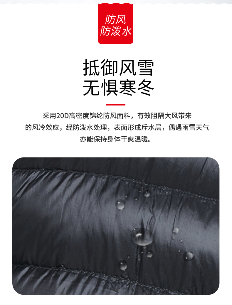 外层面料上,使用20D的高密度尼龙面料,防风防泼水。保持面料长期干爽、洁净。羽绒采用先车出羽绒隔舱后充绒的方式,缩绒针细针眼搭配粗线的防钻绒工艺。