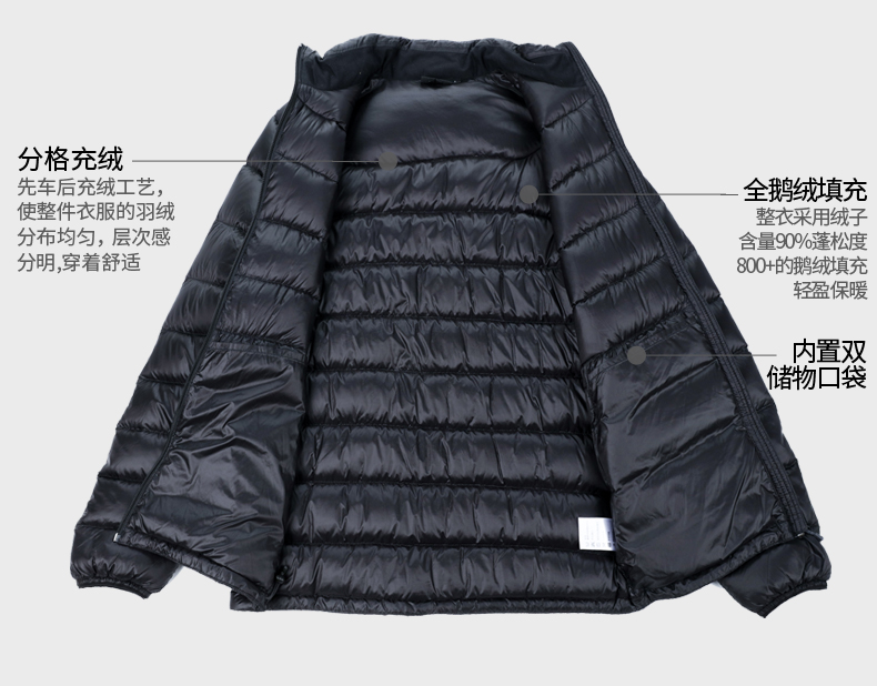 「防钻绒处理」面料与填充的羽绒,使用先车出羽绒隔舱,后充绒的方法,在制作外层面料过程中,羽绒隔舱就预先织出来,后填充羽绒,这样可有效避免羽绒从针眼钻绒。