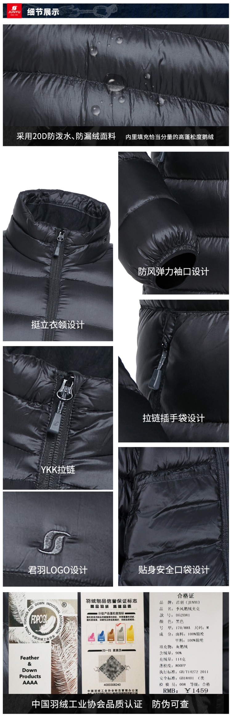在款式和细节方面,合身版型,3D立体裁剪,挺衣半高领设计,可以很好的保暖脖子;袖口是防风的,主拉链和两侧口袋拉链都是YKK的。配收纳袋,可以收纳成团,便于携带。