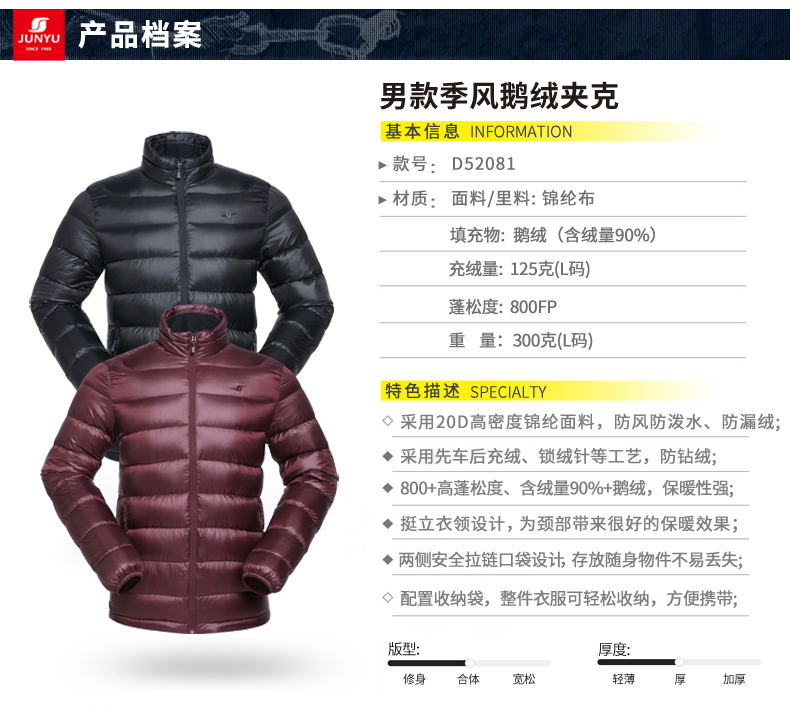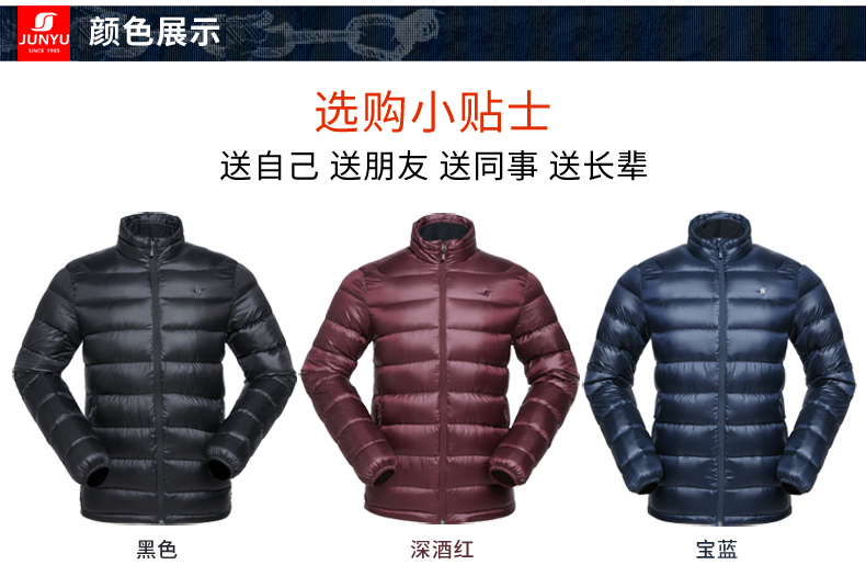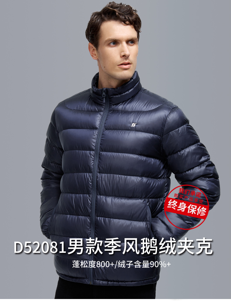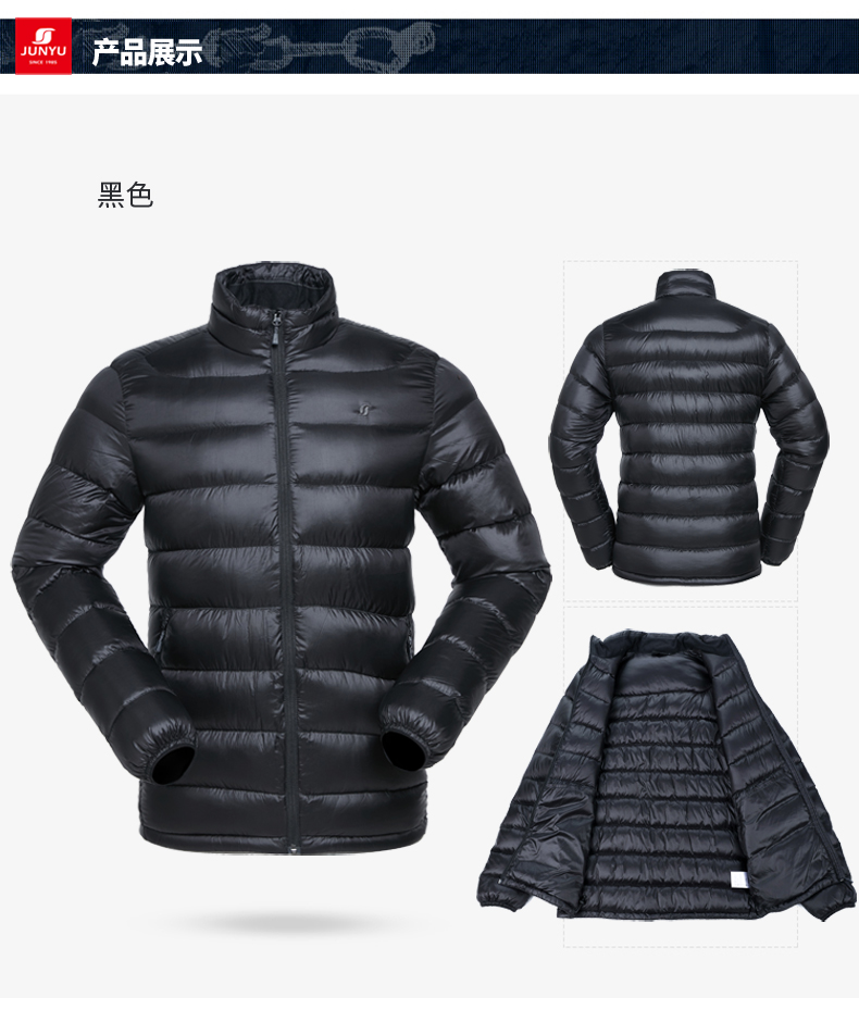 这款君羽季风男羽绒服是2019年的冬季款,属于君羽的严寒系列,填充800蓬90%的鹅绒,L码充绒量为125克,属于中等厚度,外层是东丽20D高密度尼龙面料,防小雨挡风防漏绒,内置式保暖毛绒保暖立领,适合0℃到-15℃穿着。