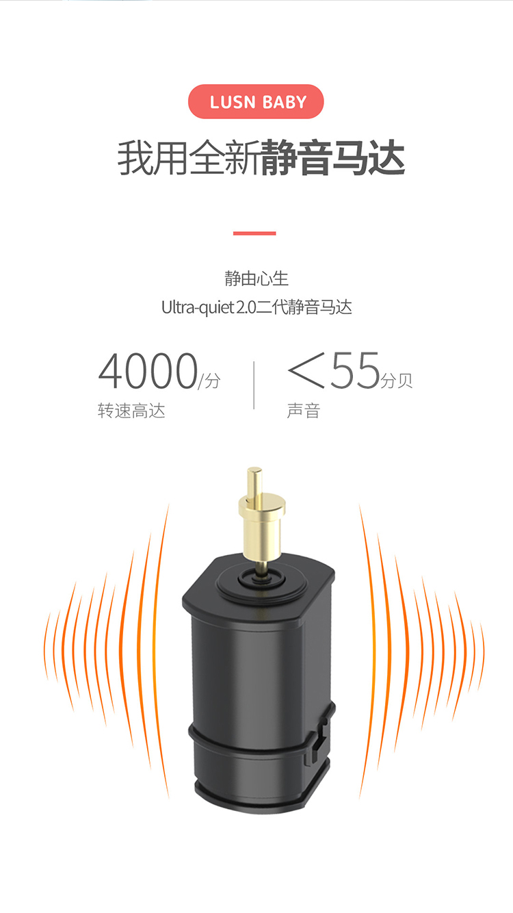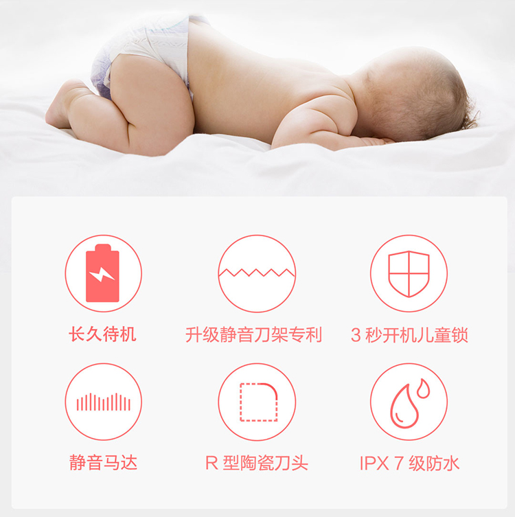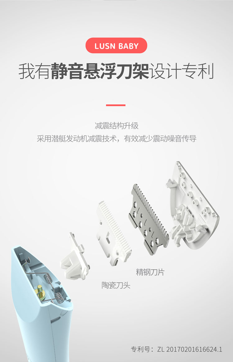 这款理发器采用精钢刀片与陶瓷刀头,内置专利悬浮刀架与全新二代静音马达,采用潜艇发动机减震技术,有效减少震动噪声传导,声音小于55分贝,即便是小朋友睡着,也能轻松理发。
