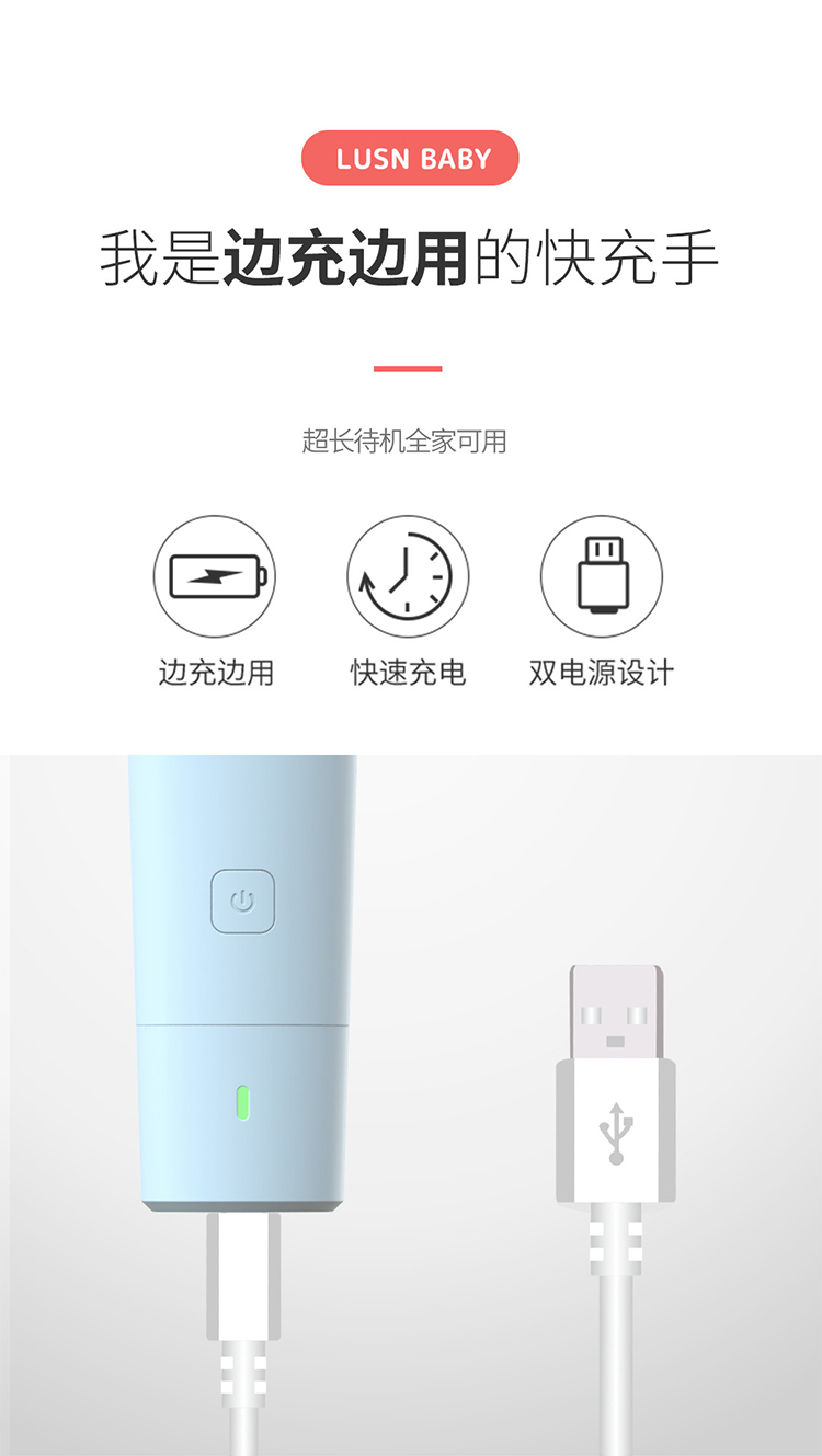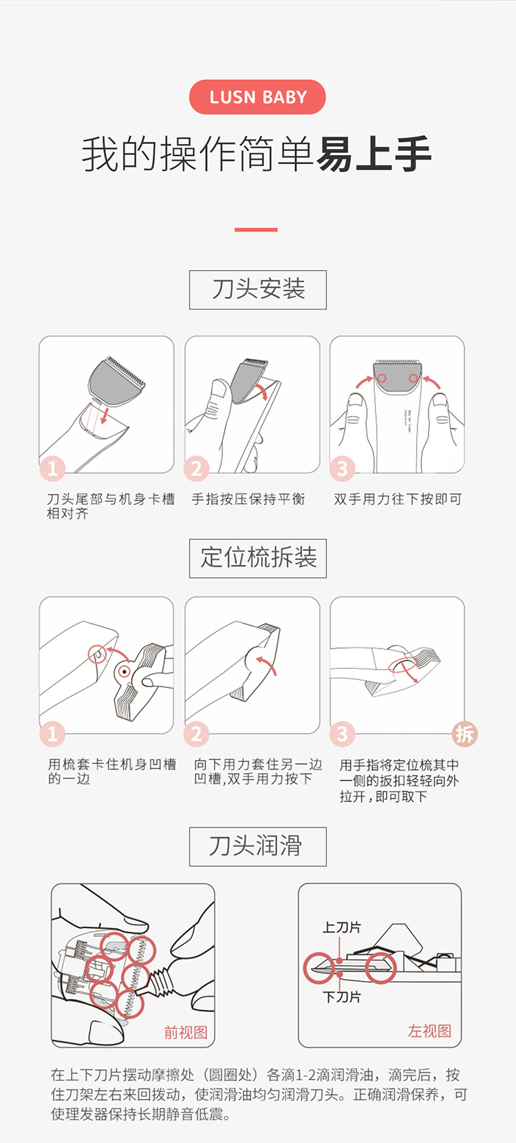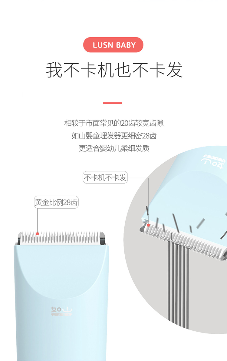 在安全方面,刀头为R型圆润触角的陶瓷材质,并且相比于市面上常见的20齿较宽的缝隙,这款更为细密的28齿设计,更适合幼儿柔细的发质,不会出现卡机卡发的情况,避免划伤或拽疼小朋友。