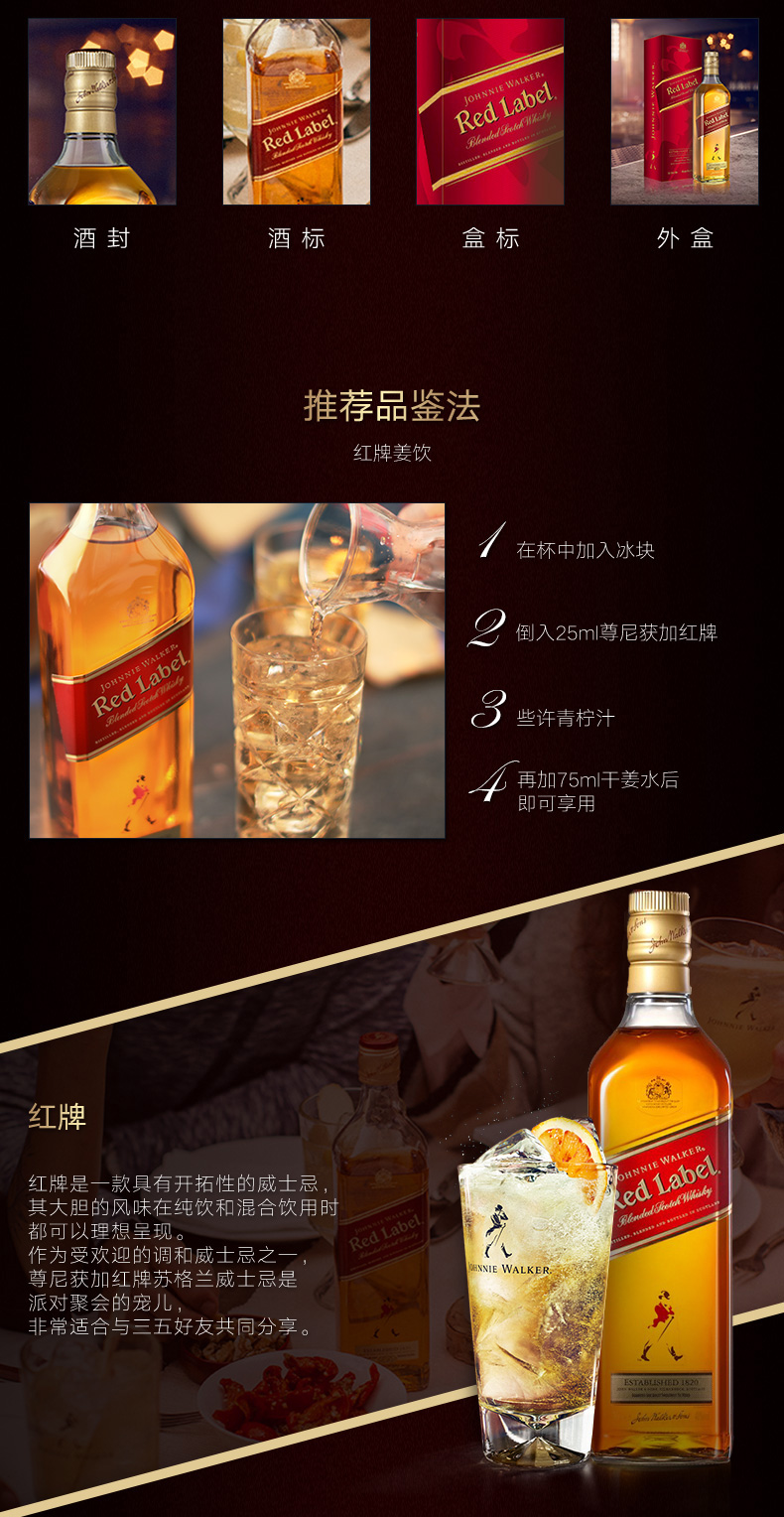 JOHNNIE WALKER尊尼获加是全球著名的苏格兰威士忌品牌,拥有200年的历史。旗下威士忌跟居市场定位不同,酒标分为红、黑、醇黑(双黑)、绿、金、铂金、蓝色,因方形瓶型也被称为红方、黑方、绿方.......每款酒使用的基酒、陈酿时间、口感、风味特点各不相同。