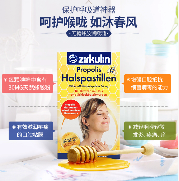 这款 Zirkulin 润喉糖含有丰富的蜂胶成分,可有效增强口腔抵抗细菌病毒的能力,愈合口腔黏膜,缓解咽喉不适的同时,贴在口腔溃疡处还能治愈空腔溃疡。
