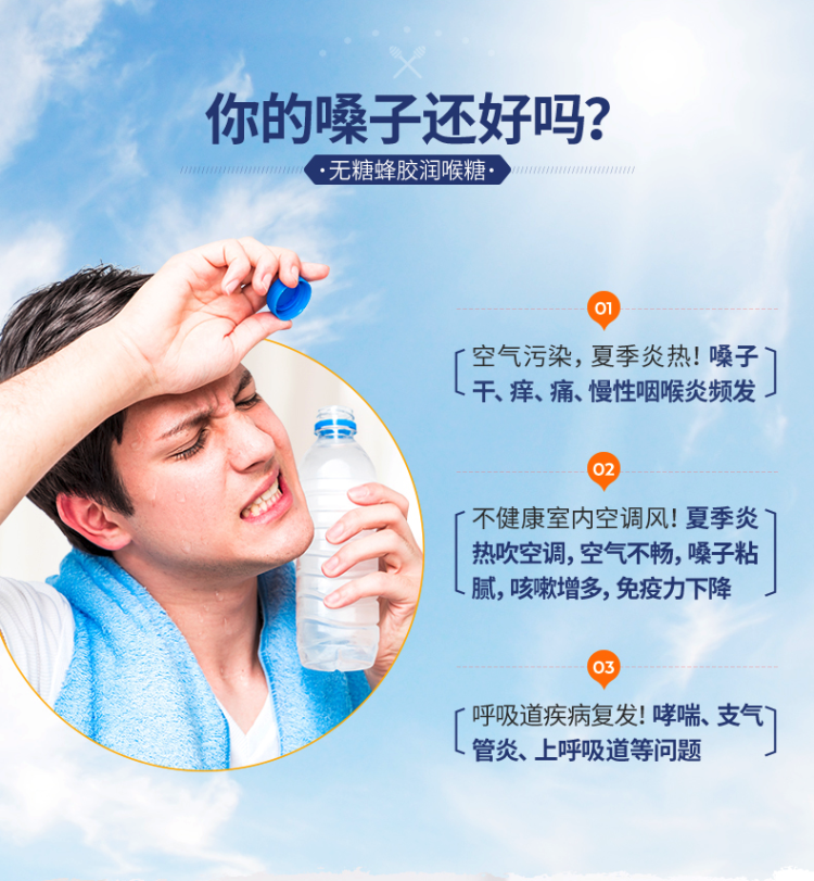 雾霾天喉咙不适、K歌声嘶力竭、一直讲课,喉咙又干又痒、慢性咽喉炎、经常抽烟、口腔溃疡的人士都可以来一颗。不含糖,糖尿病人也可以服用。