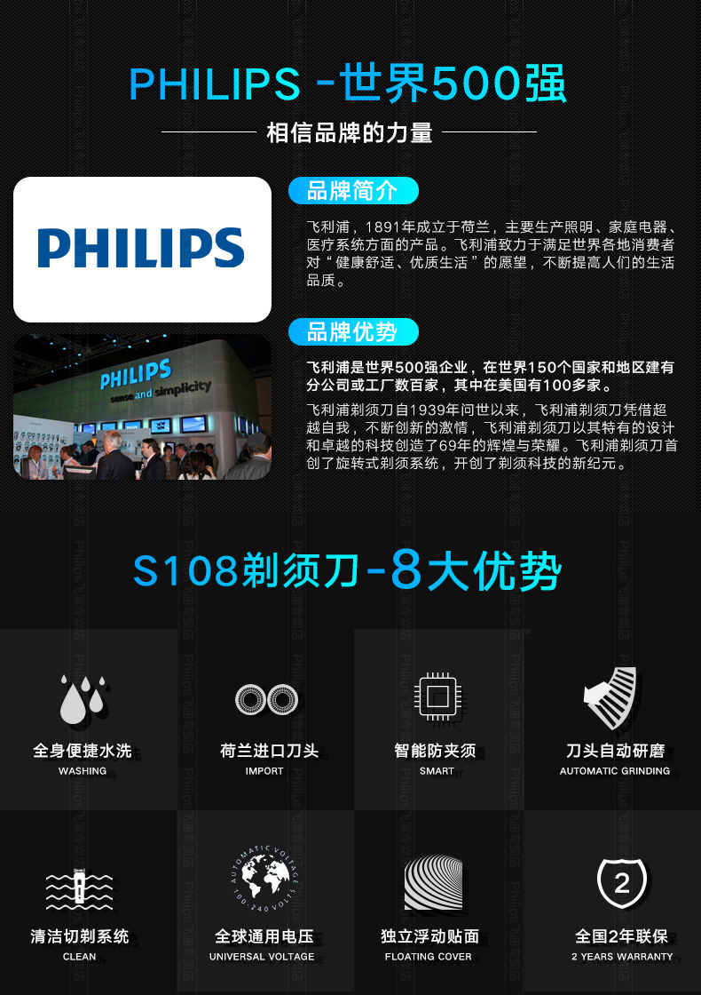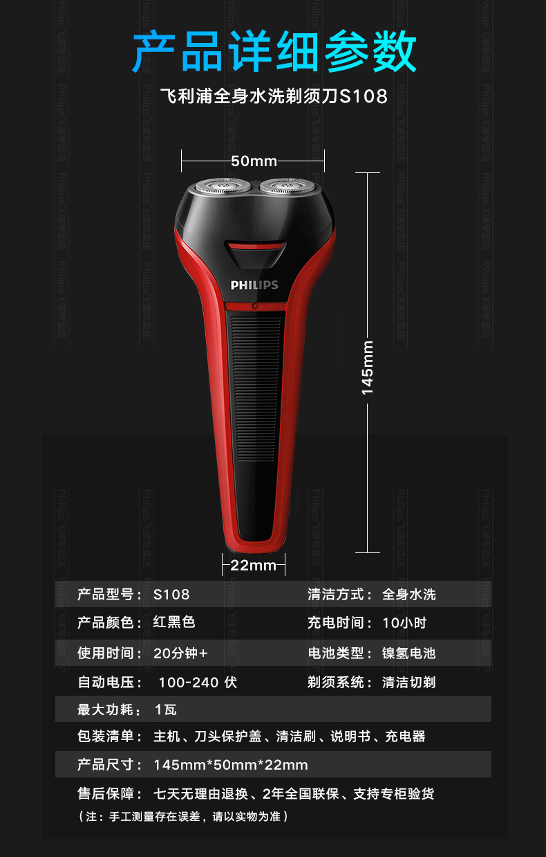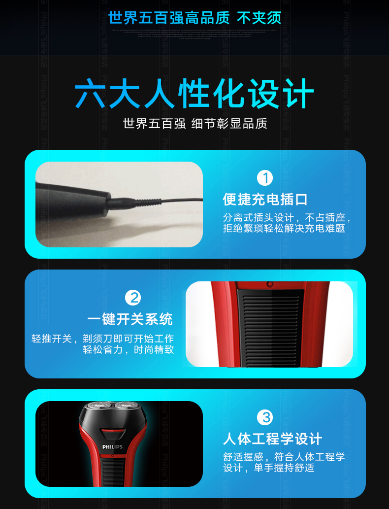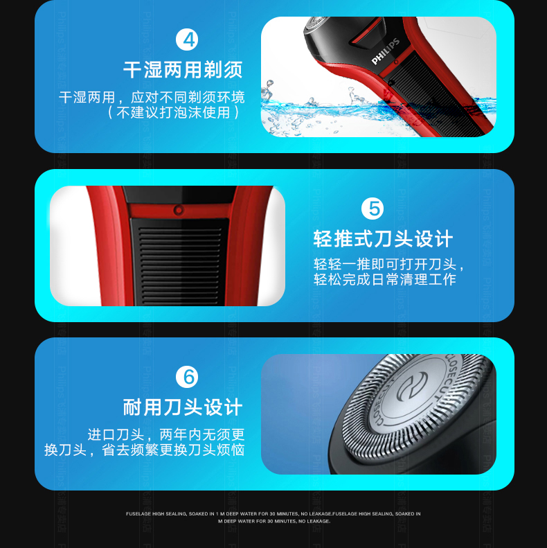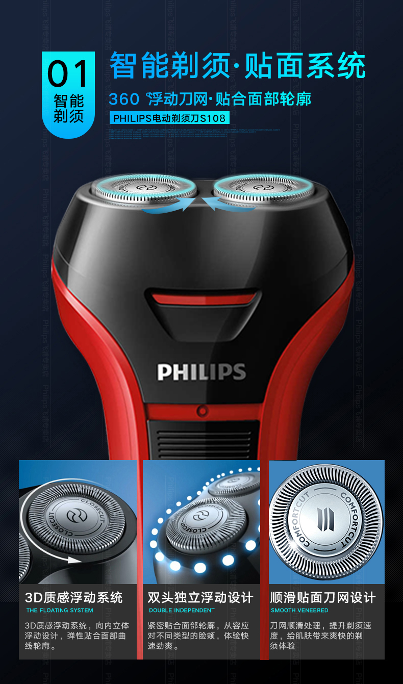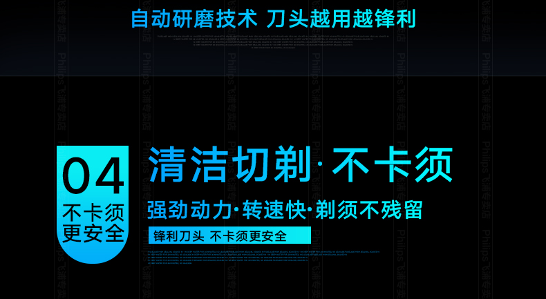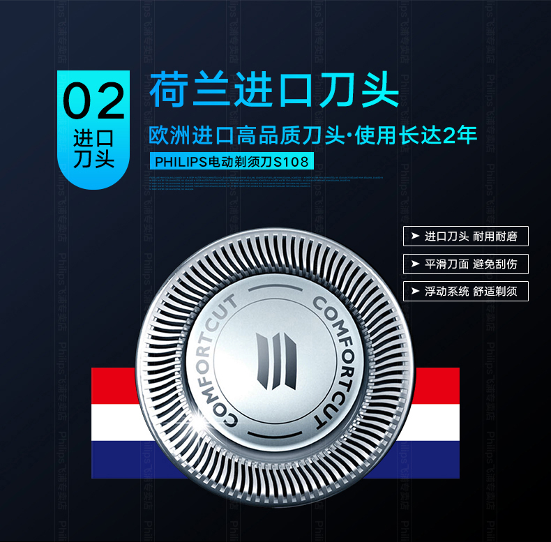 这款飞利浦S101是经典型号,欧洲原装进口自研磨刀头,采用飞利浦风驰切剃系统,能更好的捕捉毛发,持久锋利不夹胡须,360°浮动刀网,充分贴合面部轮廓,顶部顺滑贴面刀网,剃须舒适贴合,全身水洗+银离子抗菌技术,使用干净卫生。