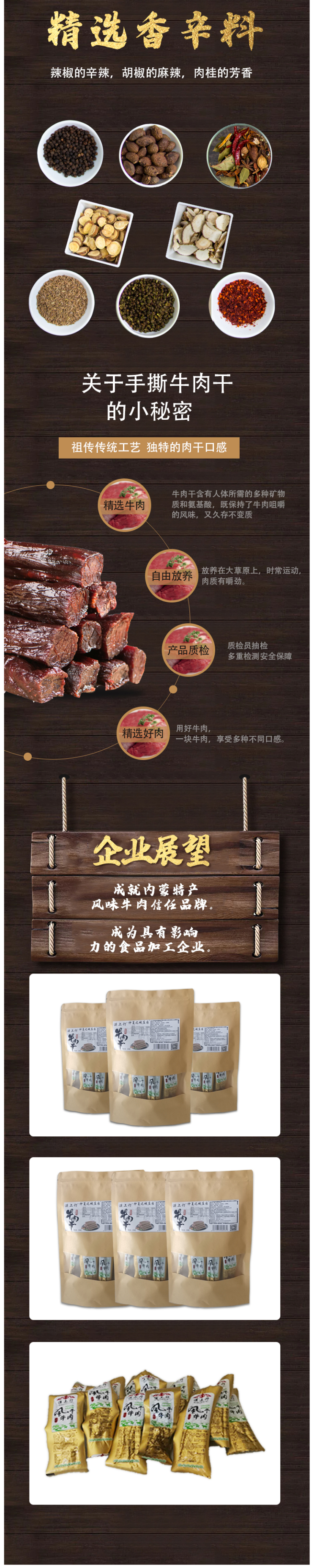 有别于现代工艺,采用传统蒙古族的工艺制程,是地道的手撕牛肉,肉干经手工切割、腌制、果木碳烤、自然风干等多道工序制作而成,外干内软,丝丝入味,有嚼劲,双层真空包装。