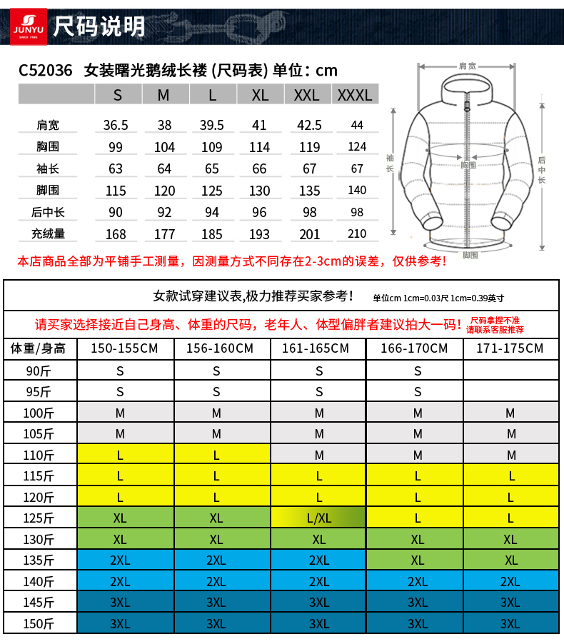 这款羽绒服的充绒量为:S码168克、M码177克、L码185克、XL码193克、XXL码201克、XXXL码210克;
