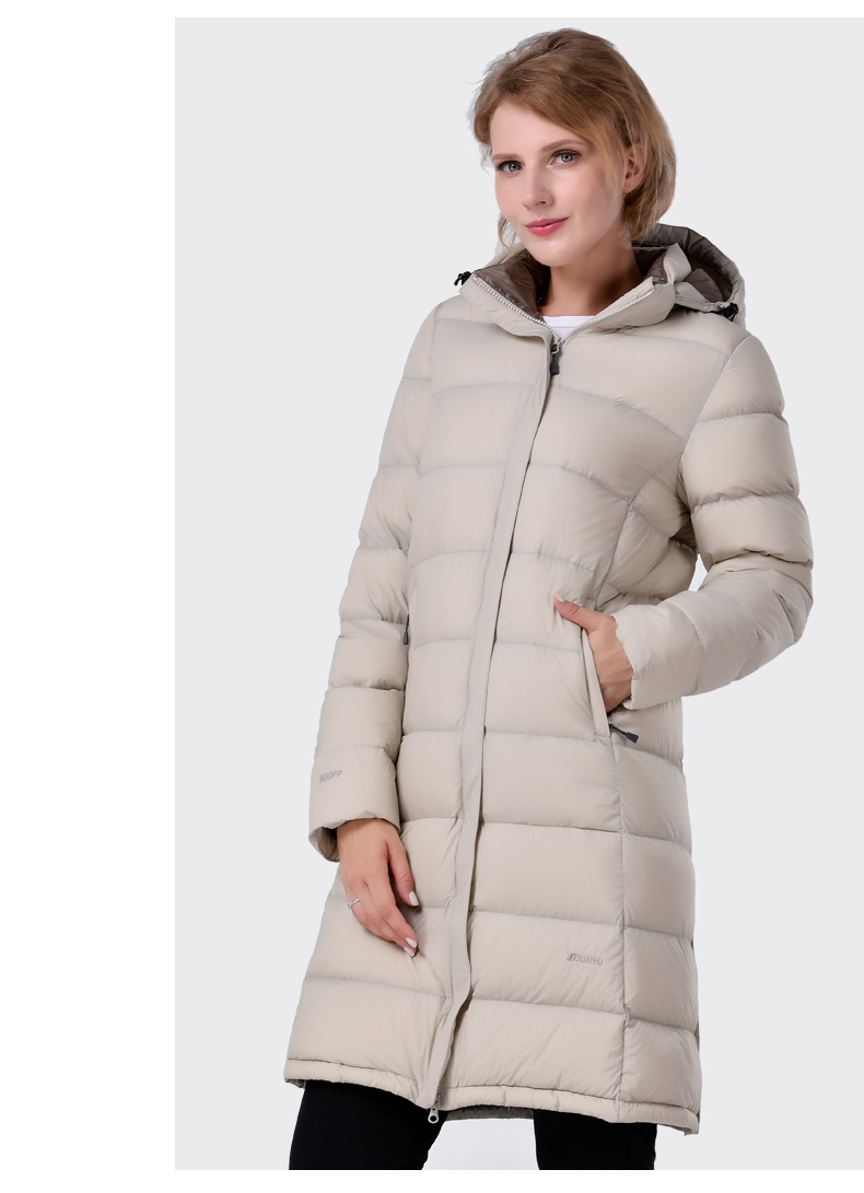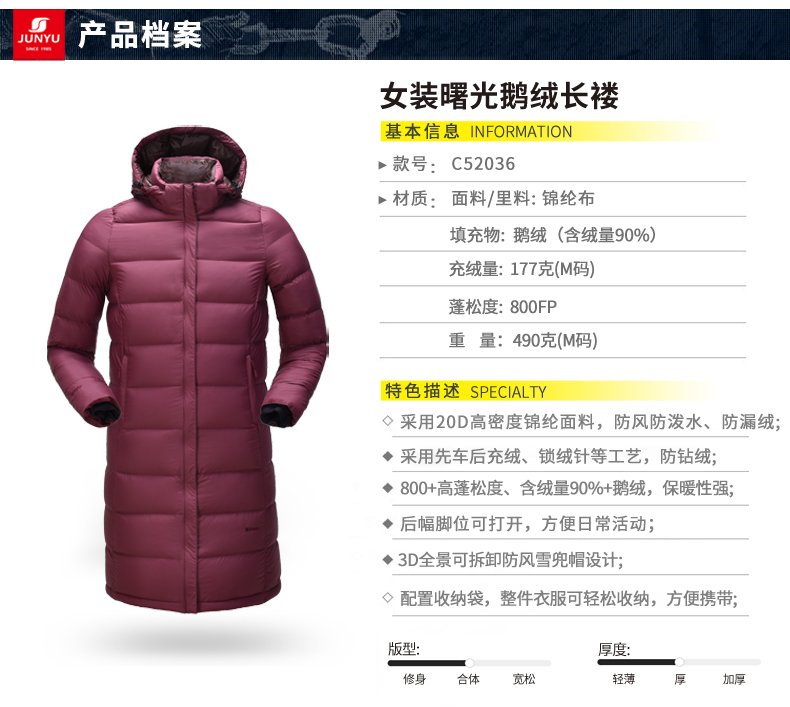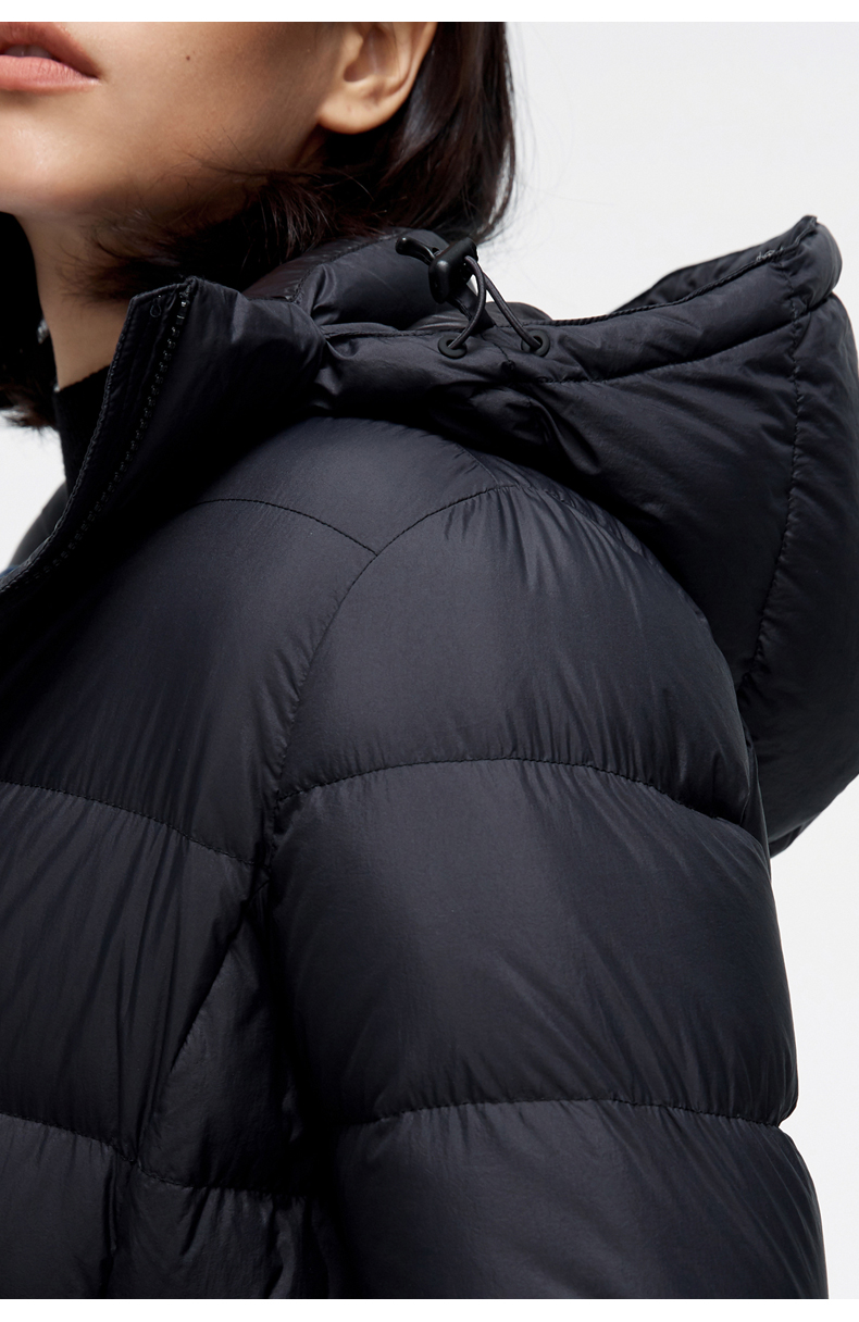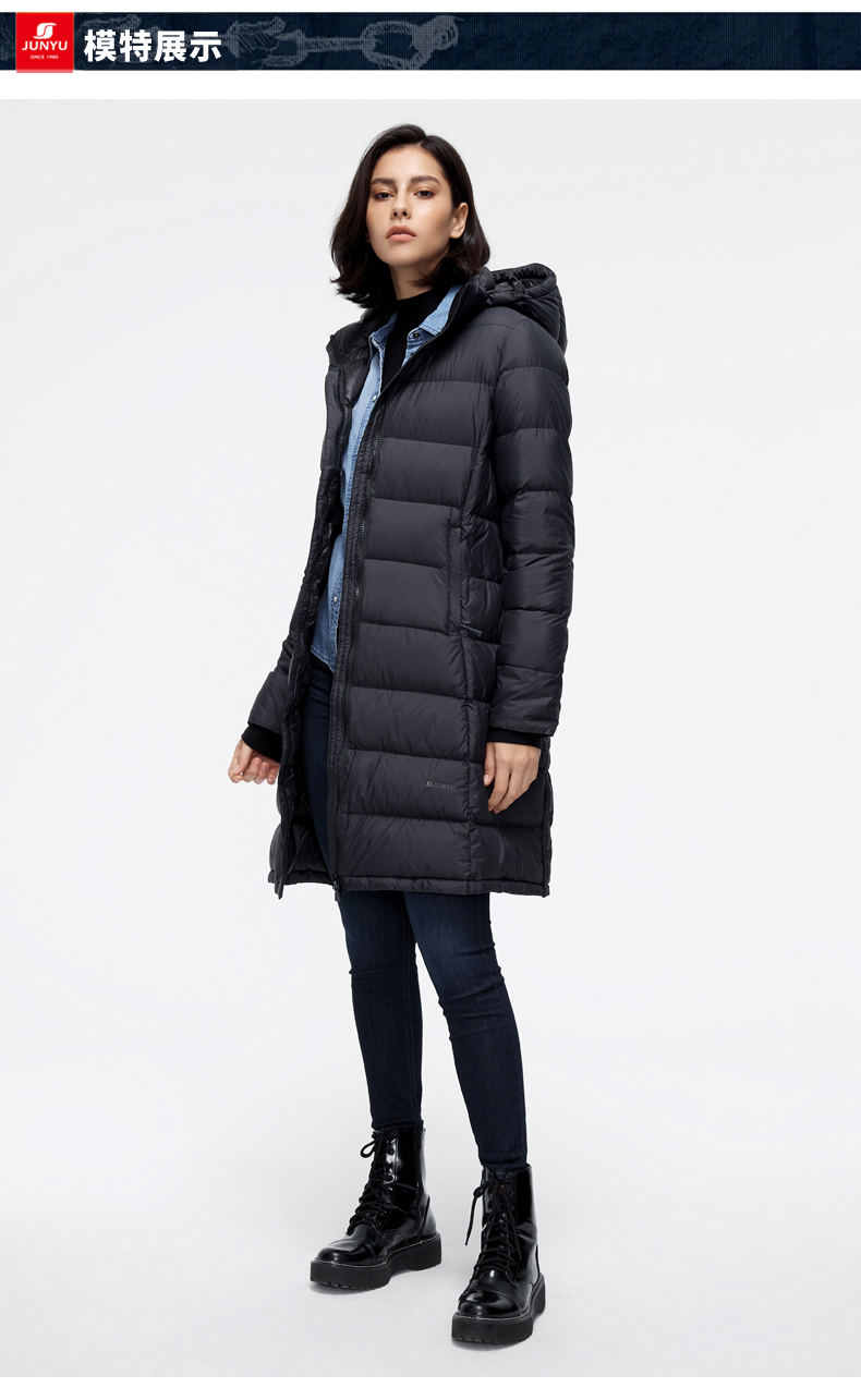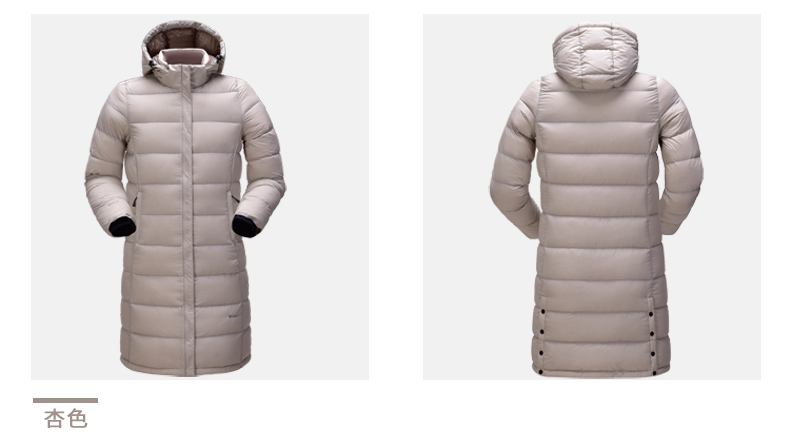 君羽曙光是中长款女士羽绒服,填充800蓬90%鹅绒,充绒量177克(M码),属于中等厚度,日本东丽20D尼龙面料。直筒款式,不挑身形都能穿,长度过臀到大腿中间,适合0℃到-15℃穿着。