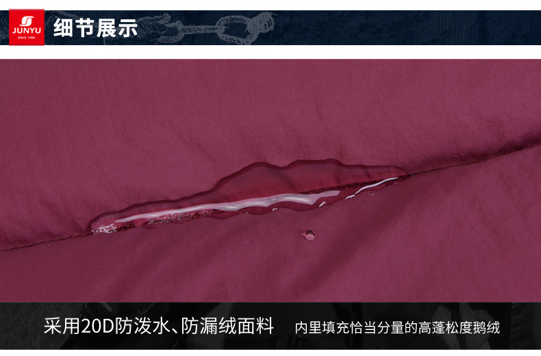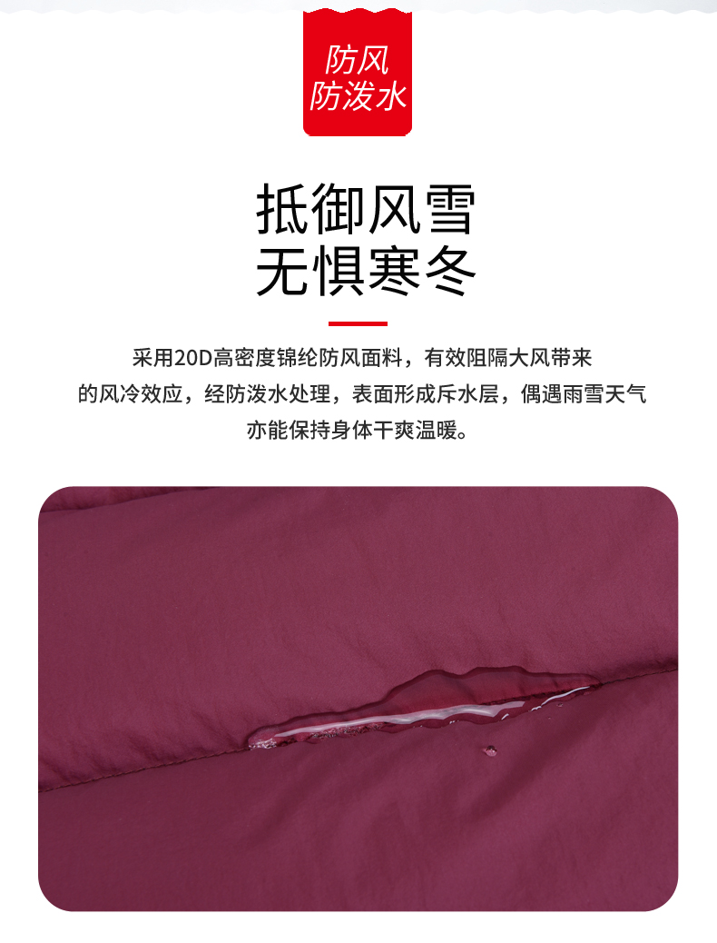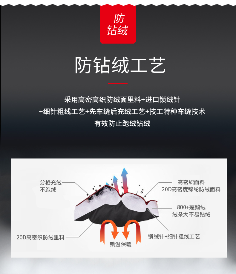 外层面料上,使用日本东丽的20D尼龙面料,防风防泼水。保持面料长期干爽、洁净。羽绒采用先车出羽绒隔舱后充绒的方式,缩绒针细针眼搭配粗线的防钻绒工艺。