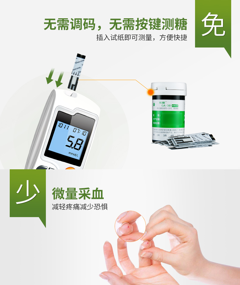 这款三诺血糖仪,配试纸50片+采血针+酒精棉片50枚,采用新型SOC测量芯片,能快速分析血液样本,急速测量5s出结果,无需等待;插条自动开机,智能免调码,无需手动设置,可明显减少测量误差,一键轻松退条。全程语音播报,使用轻松方便。