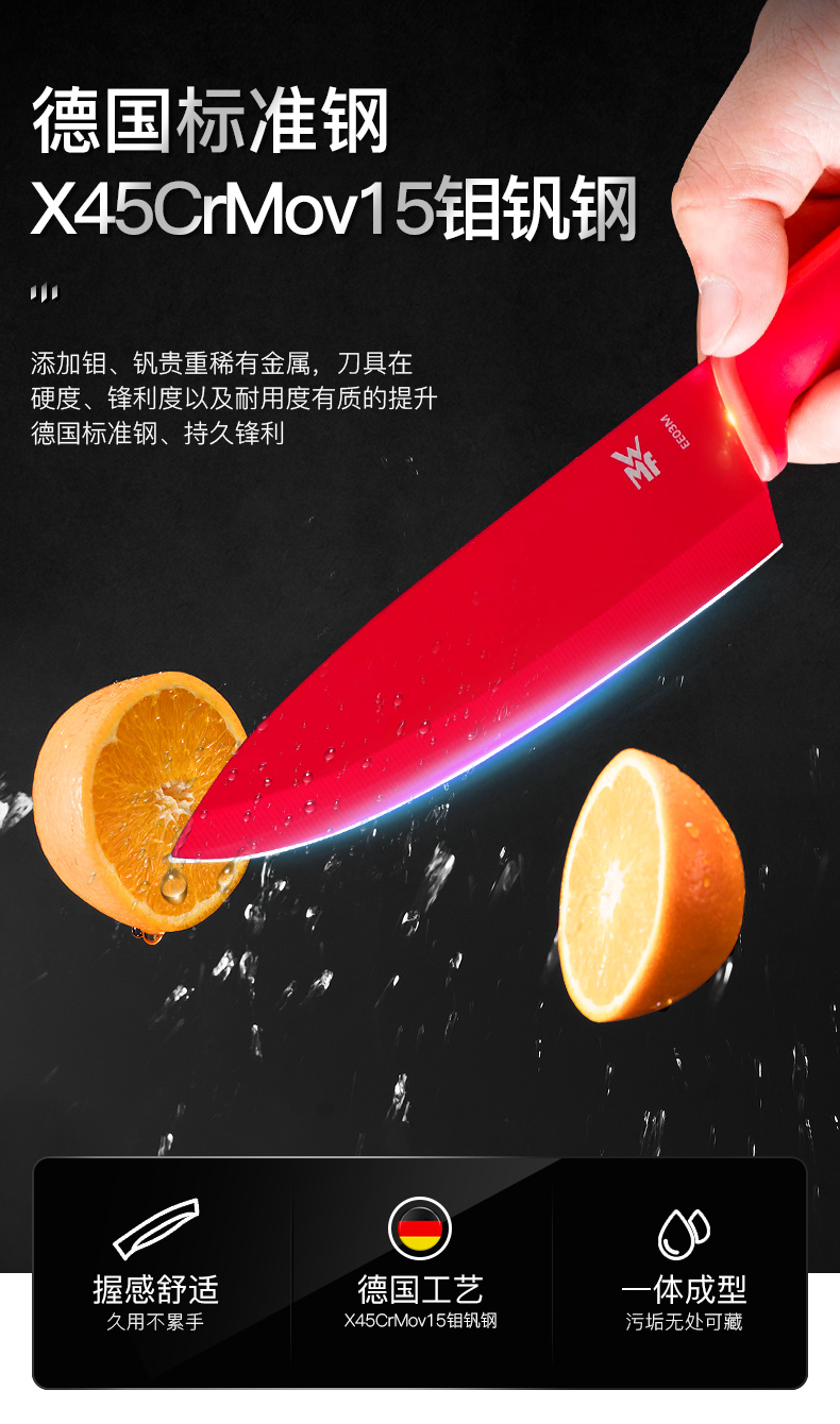 刀刃是特殊不锈钢,保证了锋利度和持久性。特种钢的含碳量0.5%左右,HRC硬度可轻松达到56以上。国内大多数采用3Cr或4Cr钢材,用一段时间就会变钝,而这款不会。除此之外也有一定的韧性,不像高碳钢容易崩,最适合普通家庭使用。V型的刀刃口,能快速切割,减少了对食物因子的破坏。