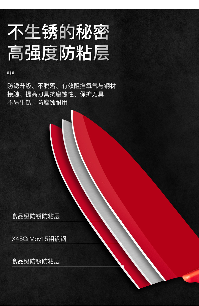 刀面有一层食品级防锈不粘层,使用时不会粘黏食物,卫生干净,易清洗耐腐蚀,也不易滋生细菌。