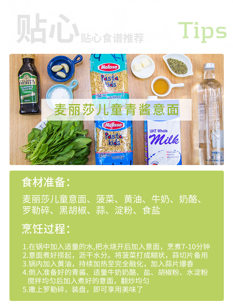 这款麦丽莎意大利面是专为儿童设计,把面条做成卡通造型,希腊原装进口,以杜兰小麦为原料,这个品种属于硬质小麦,具有高密度、高蛋白质、高筋度等特点,做成的意大利面呈金黄色,耐煮、面质软弹,口感劲道爽滑。
