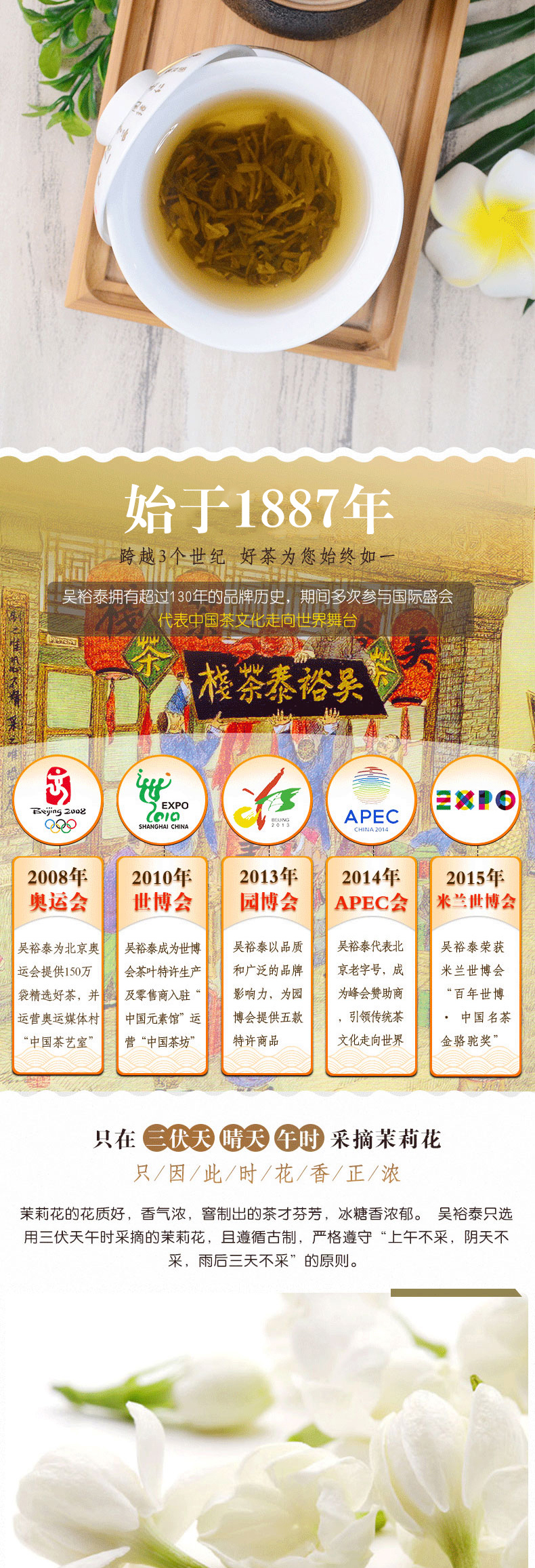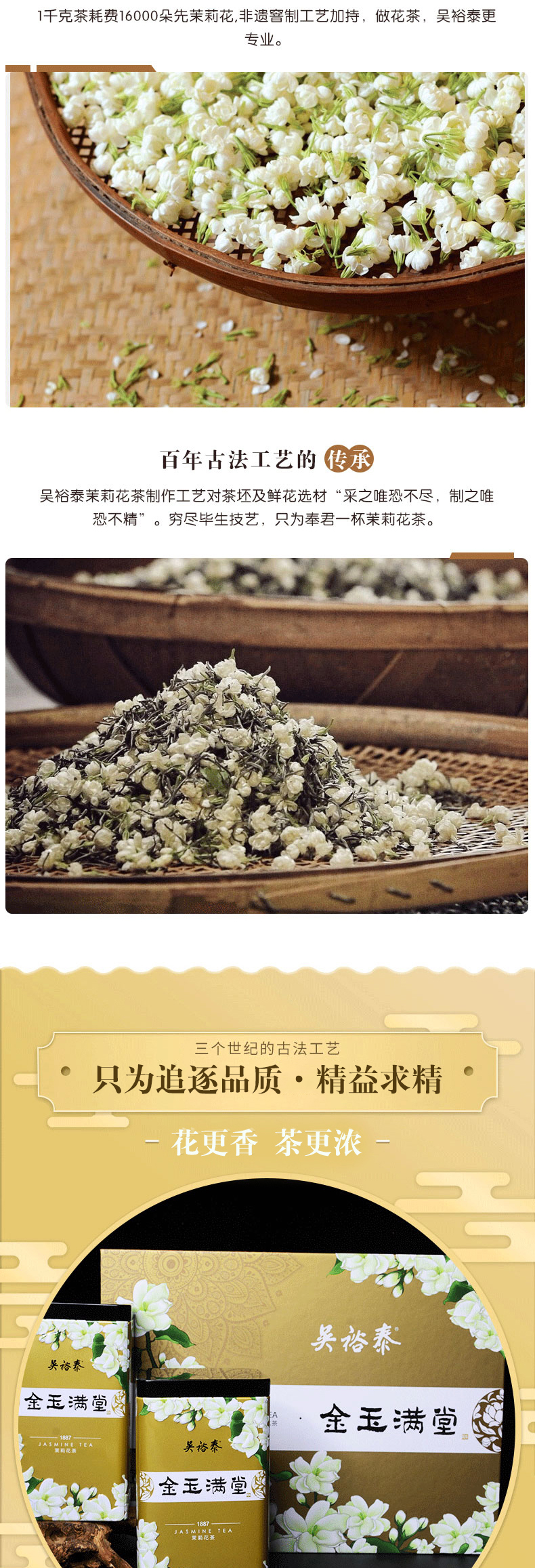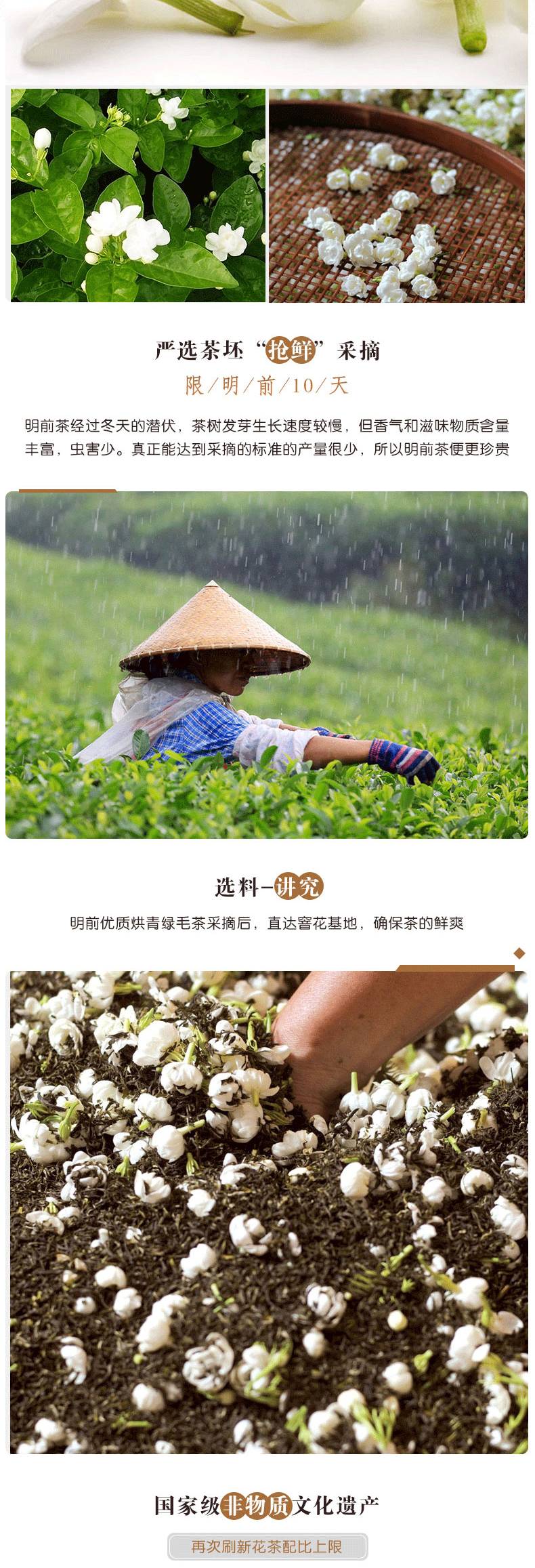 茉莉花为三伏晴天的午时采摘,严格遵循古制,茉莉花的花质好,香气浓,窨制出的茶冰糖香浓郁,优选明前绿茶,只在清明前10天采摘,标准很高,沿袭国家级非物质文化遗产制作工艺,1千克茶耗费16000朵茉莉花,干茶芽豪壮实,黄绿较润,汤色黄亮,花香浓郁。