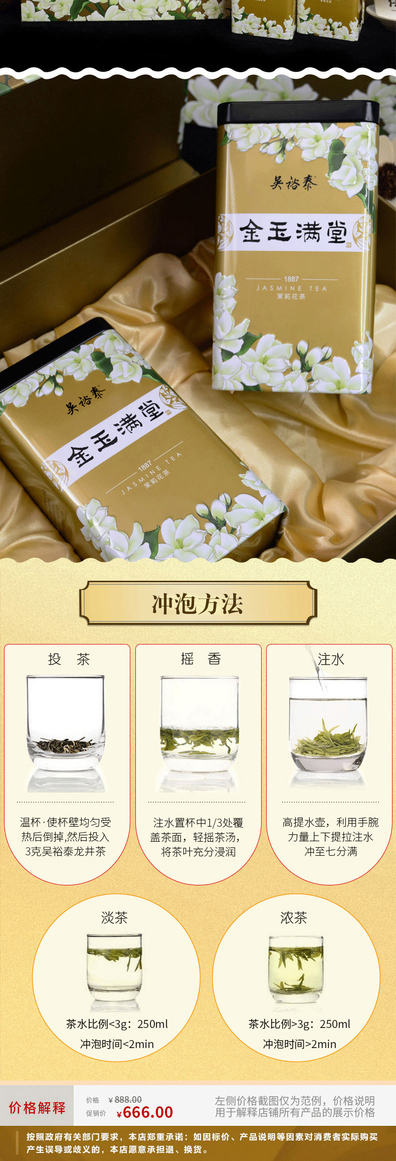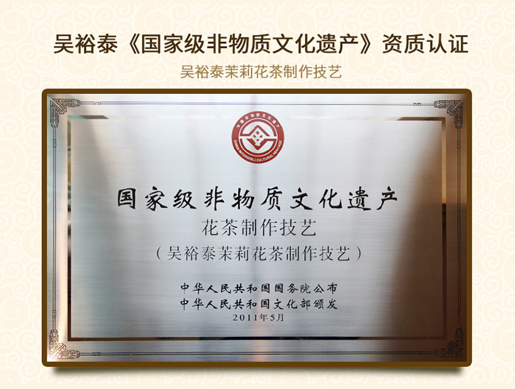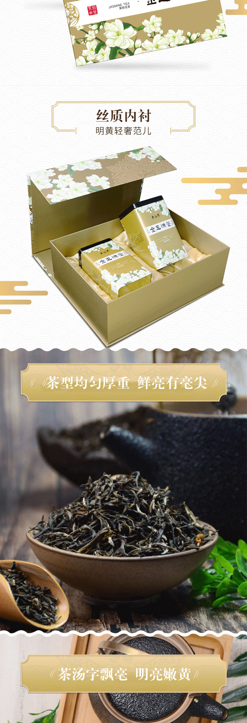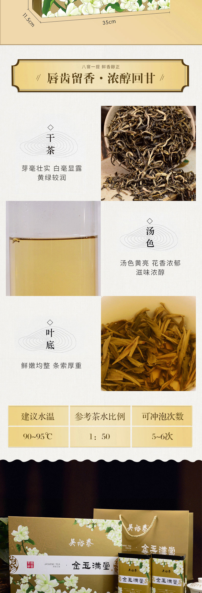 茉莉花为三伏晴天的午时采摘,严格遵循古制,茉莉花的花质好,香气浓,窨制出的茶冰糖香浓郁,优选明前绿茶,只在清明前10天采摘,标准很高,沿袭国家级非物质文化遗产制作工艺,1千克茶耗费16000朵茉莉花,干茶芽豪壮实,黄绿较润,汤色黄亮,花香浓郁。