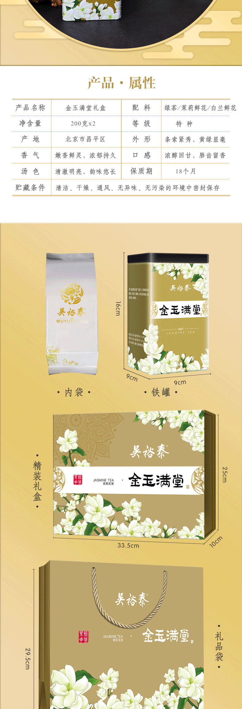 这款金玉满堂是吴裕泰的主打款,礼盒上的金玉满堂四个字由书法家郑仁龙先生手书,礼盒明黄轻奢,内里丝质内衬,高端感觉。