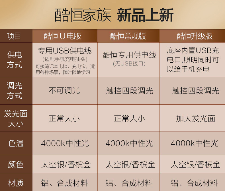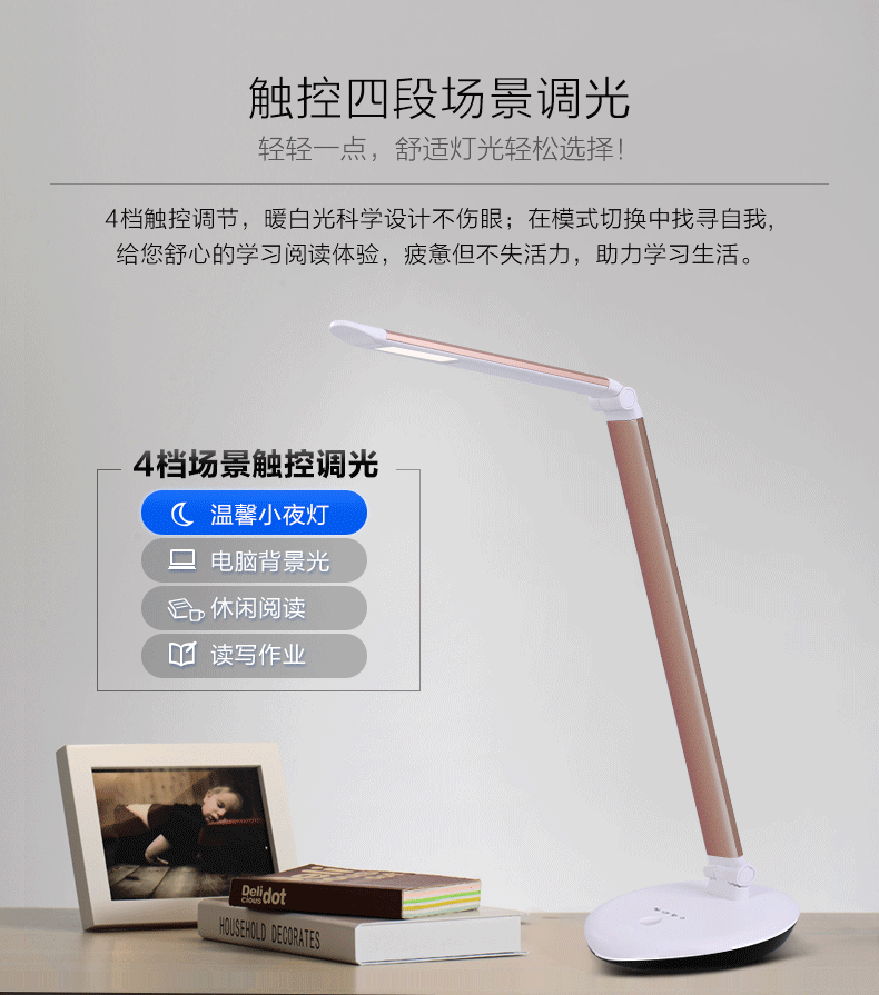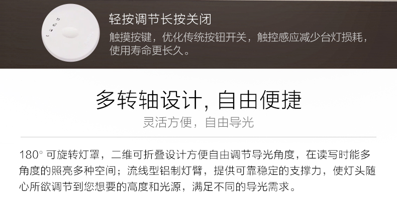底座内置了一个USB充电口,照明的同时还能给手机充电,作为移动电源使用(高校住宿生福利,再也不用为手机充电烦恼);单独触控按键控制,轻按调光,长按关闭,灯珠寿命长达15000小时。