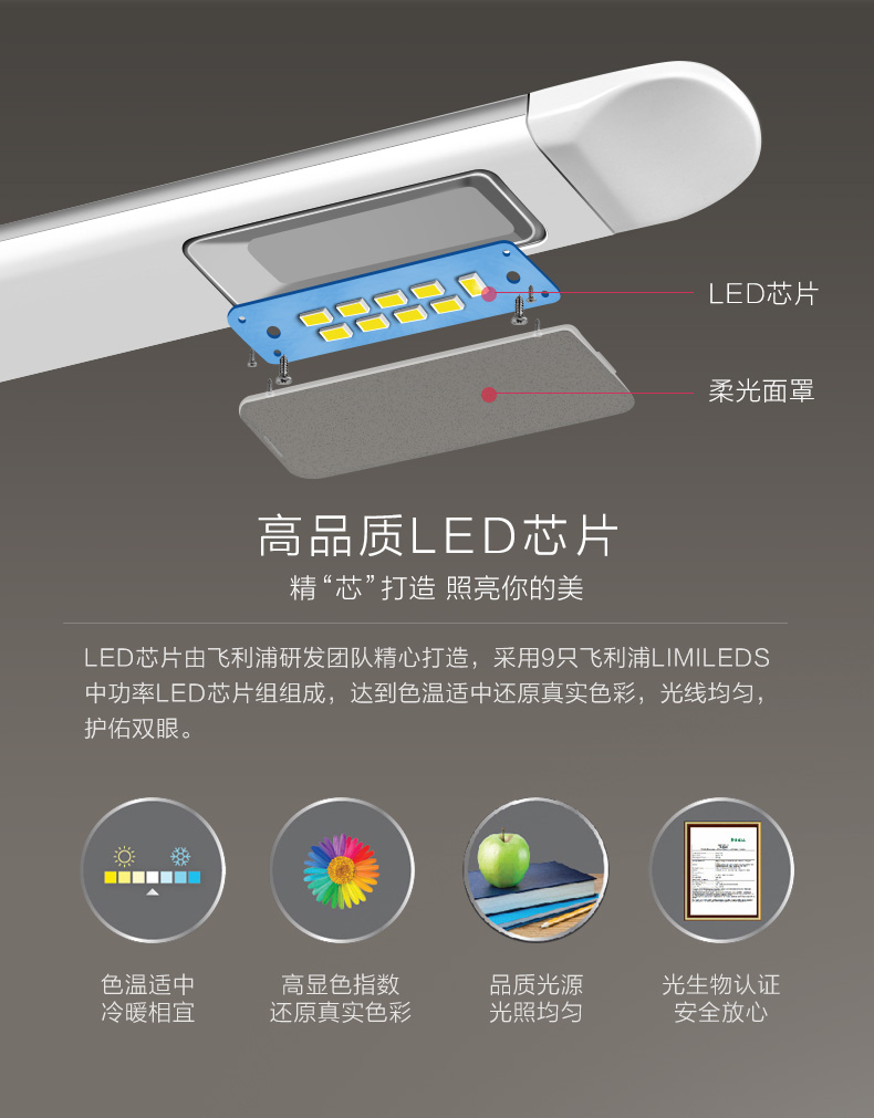 光源是由9只飞利浦LIMILEDS中功率的LED芯片组成,功率4.5W,色温4000K,相当于36W白炽灯的亮度,光线均匀稳定,相比于白炽灯能更好的保护双眼;光源显色指数大于80,能最大程度的还原真实色彩;