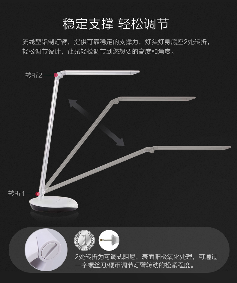 灯珠外的平板分光片,可以令光线更加柔和,还能有效提高光能的使用效率;四档灯光模式,灯罩能180°自由调节,灯头灯身和底座2处也可转折,能满足不同角度的使用需求,转折处为可调式阻尼,可调灯臂松紧程度,使得整体更加稳定。