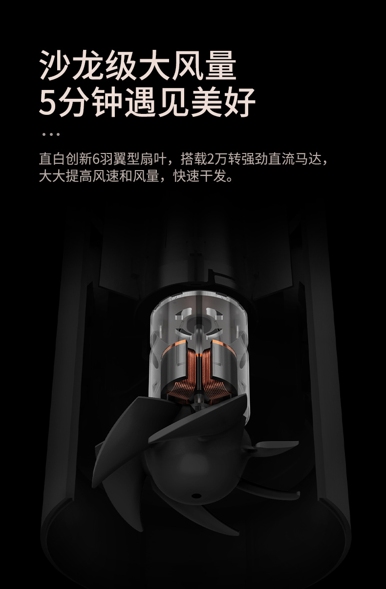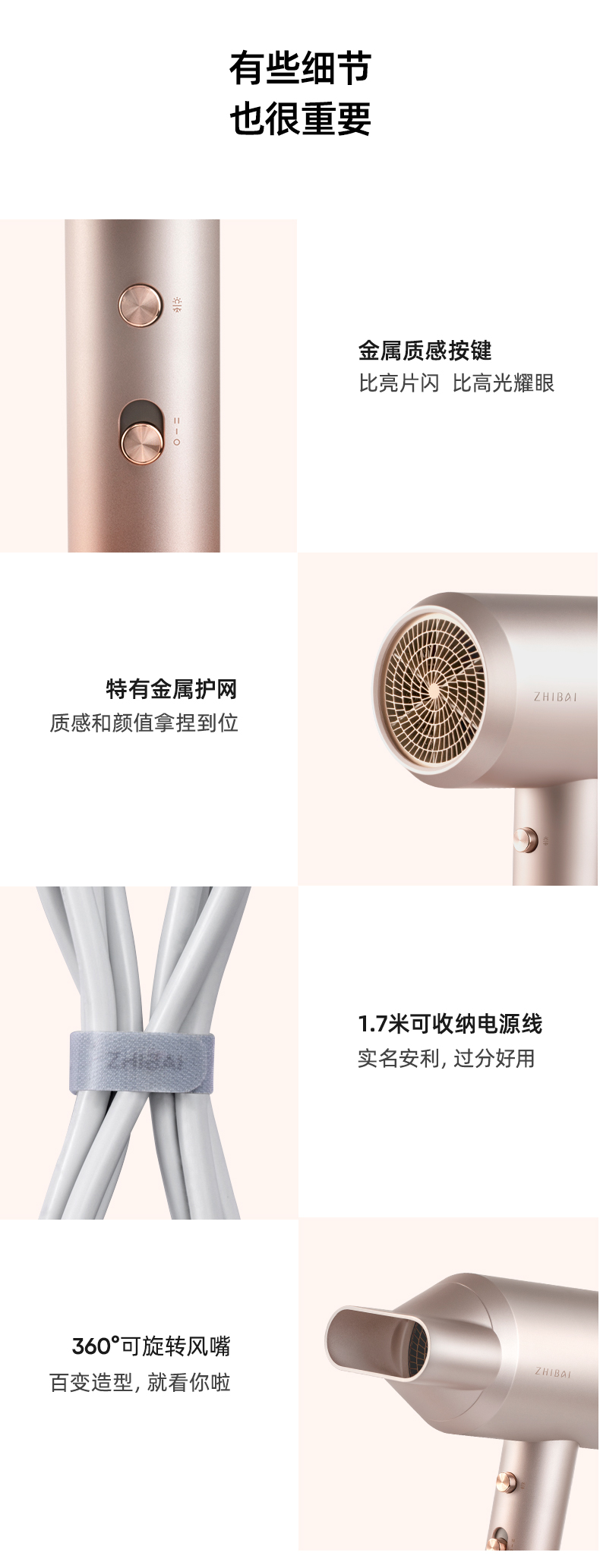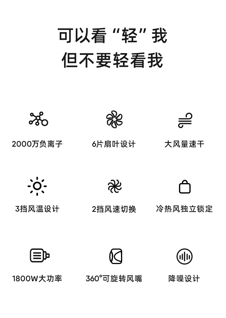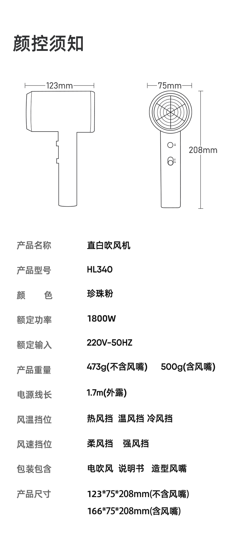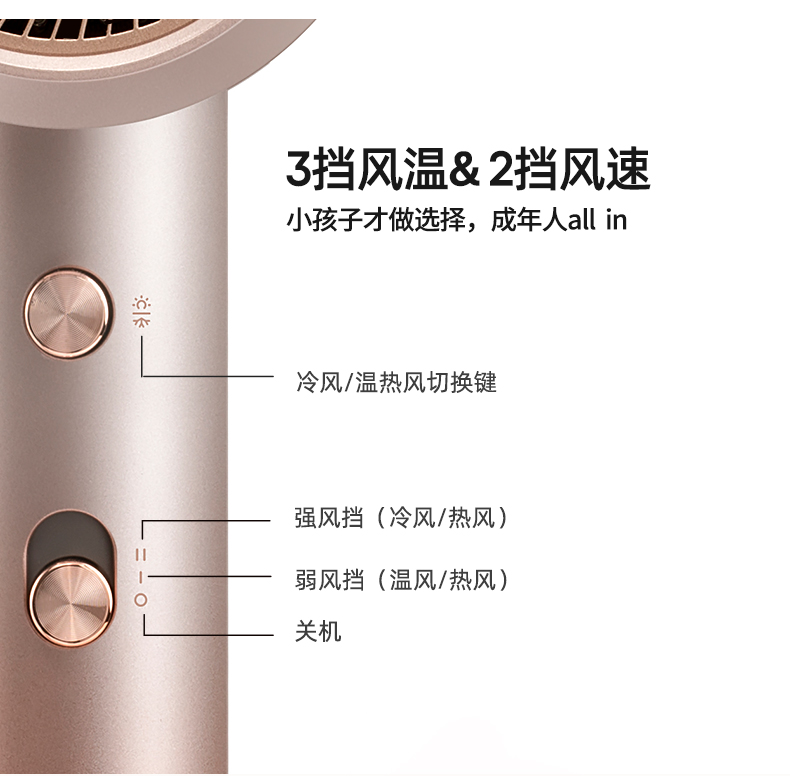 内部23圈合金发热丝错层排列,均匀发热不伤发;内置优质温控器,三挡风温可调,安全有保障,机身小巧轻盈,全机仅476g,人性设计,手持不累,底部手柄无缝设计,表面两次烤漆,手感细腻光滑,抗污耐刮,颜值高。