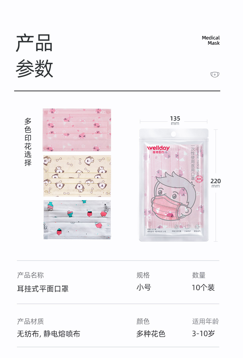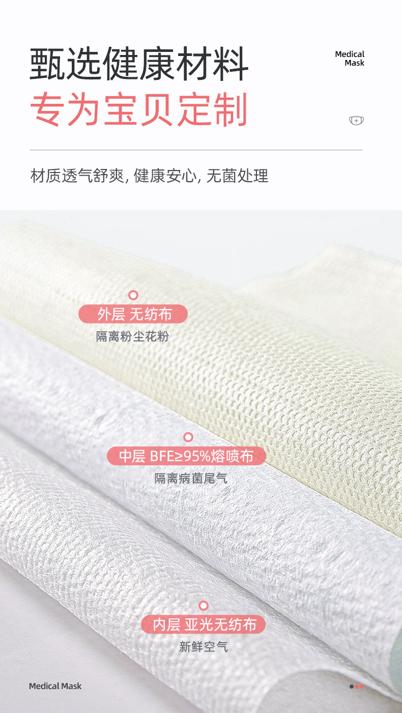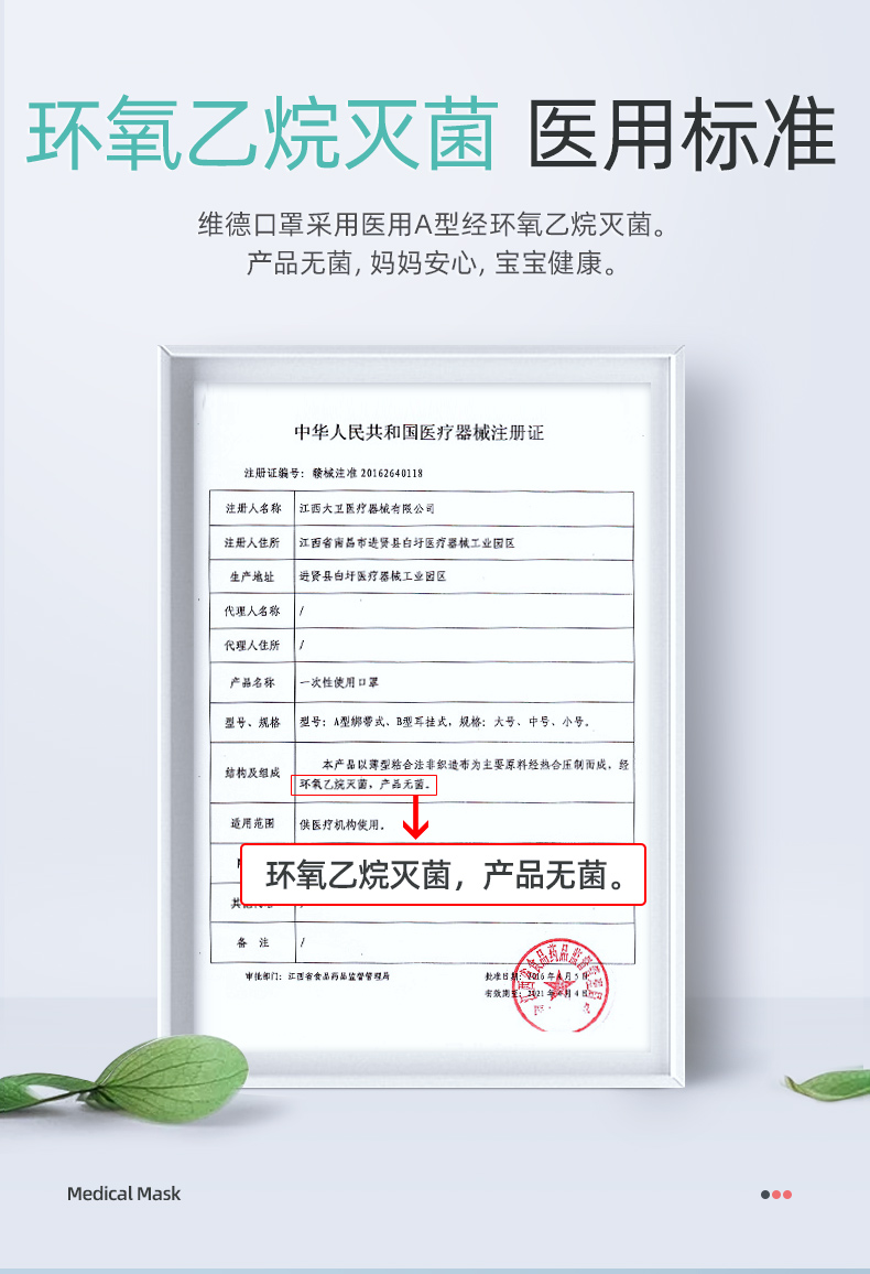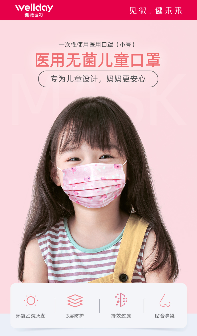 专用的儿童口罩,经过灭菌处理,药监认证,医用外科品质,赣械注准20202140043,执行标准号:YY0469-2011,环氧乙烷灭菌安全放心,维德甄选bfe>95%熔喷布,隔离微生物病菌,三层过滤,静享呼吸,牢固防脱,点焊技术。