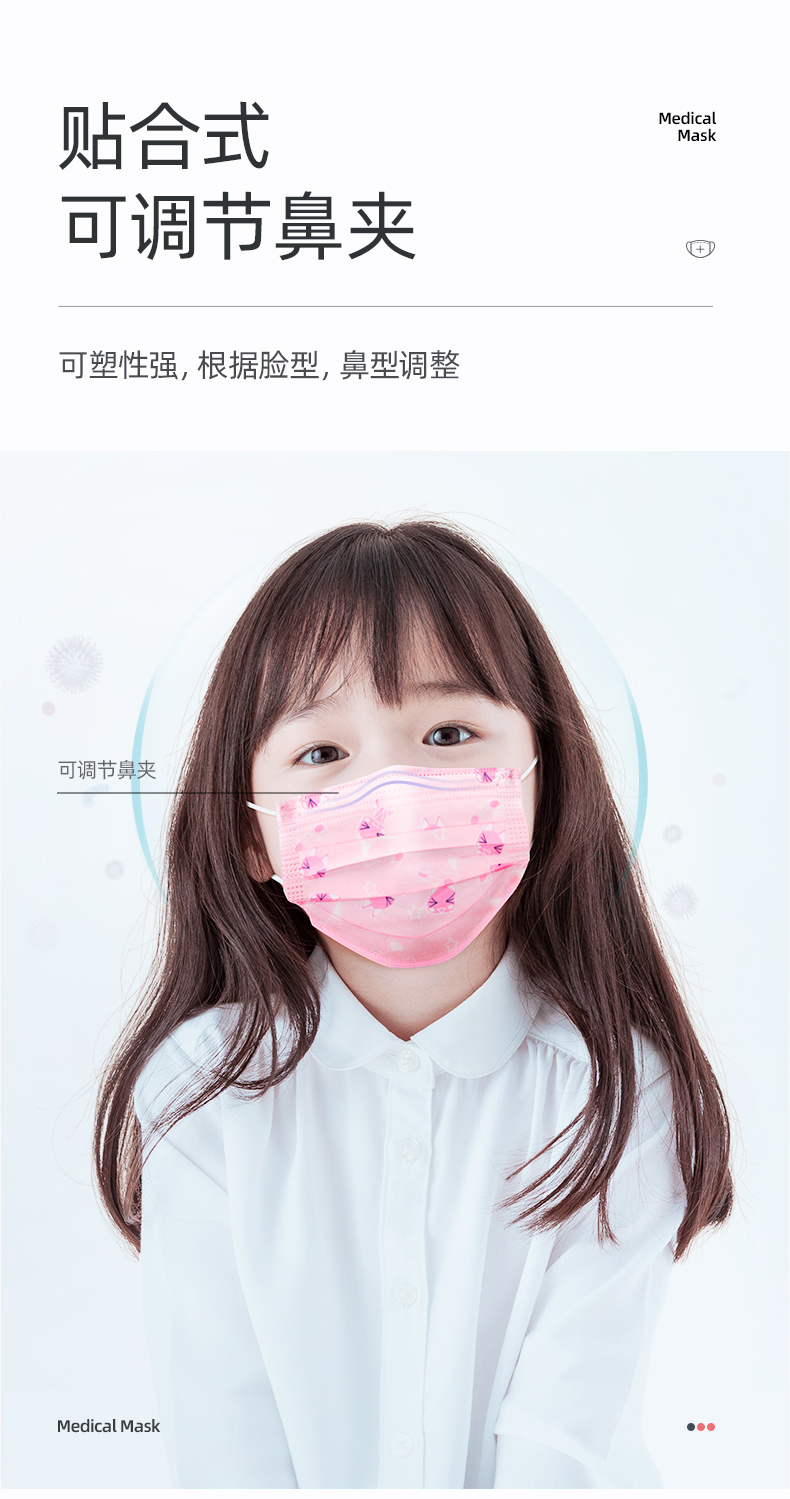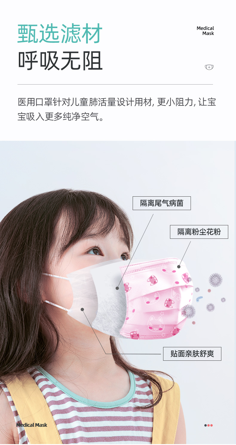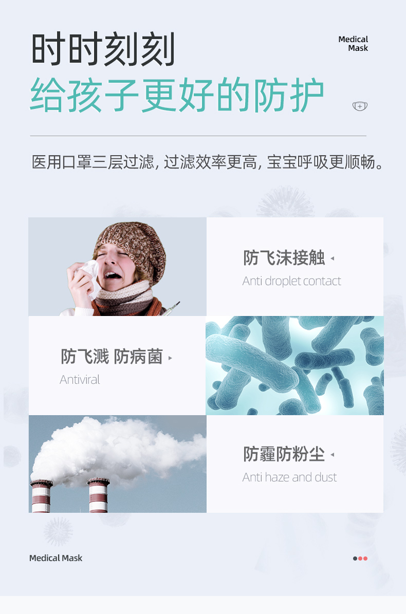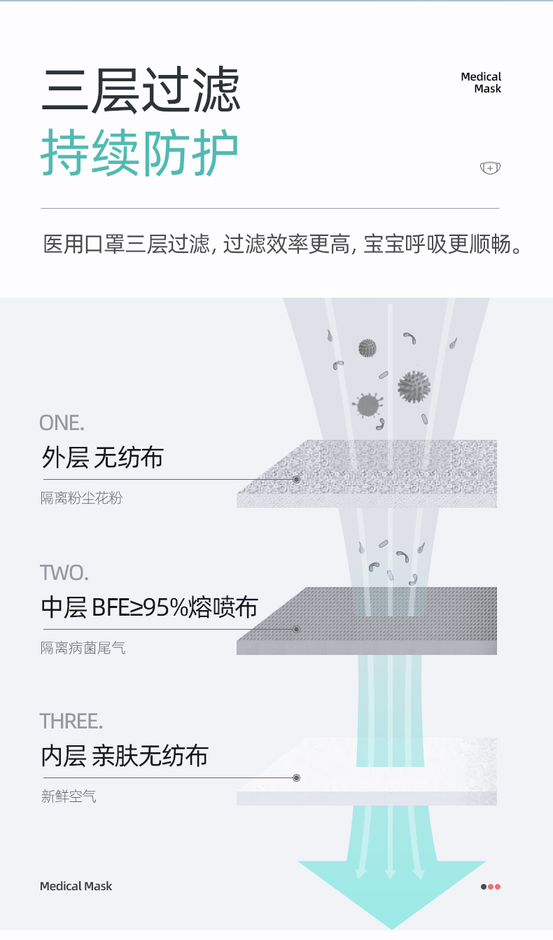 专用的儿童口罩,经过灭菌处理,药监认证,医用外科品质,赣械注准20202140043,执行标准号:YY0469-2011,环氧乙烷灭菌安全放心,维德甄选bfe>95%熔喷布,隔离微生物病菌,三层过滤,静享呼吸,牢固防脱,点焊技术。