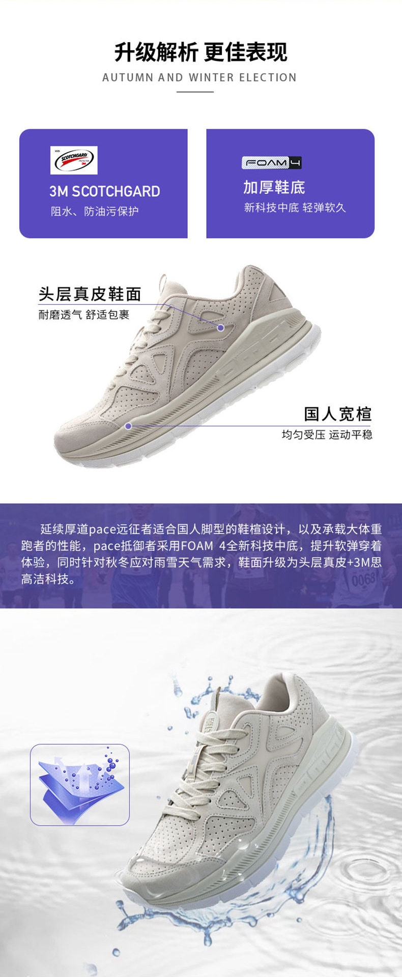 鞋楦优化了前脚掌宽度,鞋面包裹脚掌,使脚步受压更均匀,鞋面是头层牛皮+3M防污科技,触感更软也更耐脏,还有透气孔,不会捂脚,能适应秋冬时的雨雪天气。