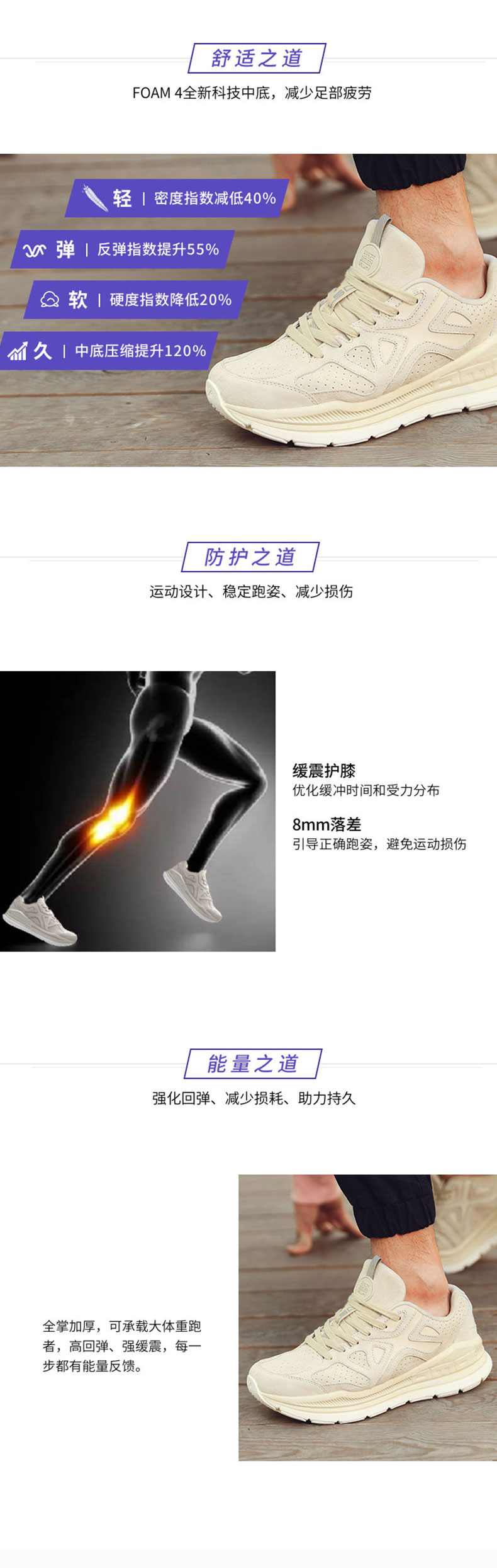 必迈Pace抵御者,是为大体重用户设计的长距离慢跑鞋,使用由超轻配方EVA缓震材料制成的FOAM 4全新科技中底,中底全掌比平常跑鞋厚约1cm,提供轻量优秀的缓震性能,大大缓解了膝盖与脚踝压力。