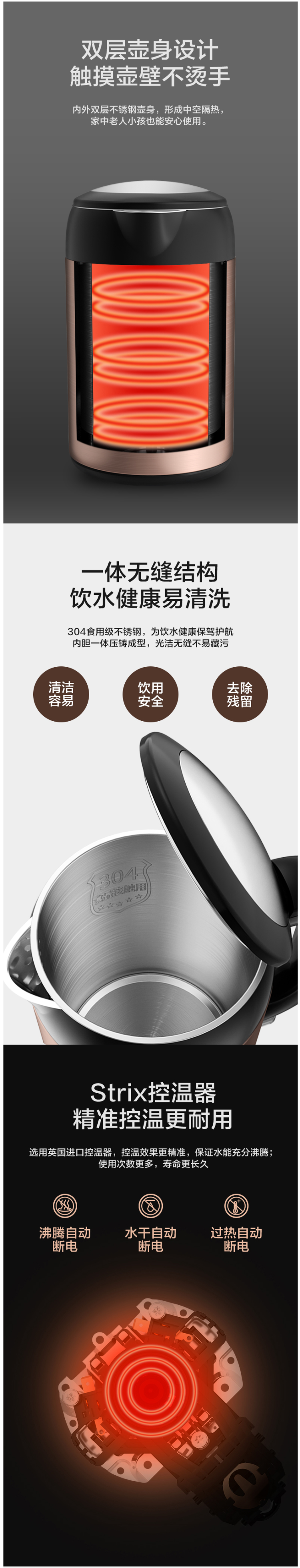 圆润包钢壶嘴,边角圆润防刮伤;进口英国Strix温控精准控温,自动蒸汽感应,水开即停,还有防干烧及过热断电三重保护,保证使用安全。