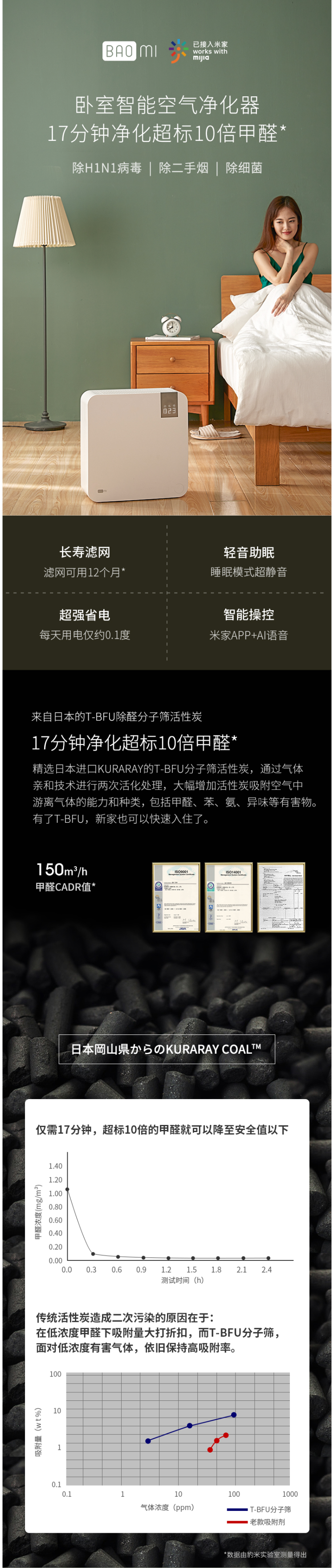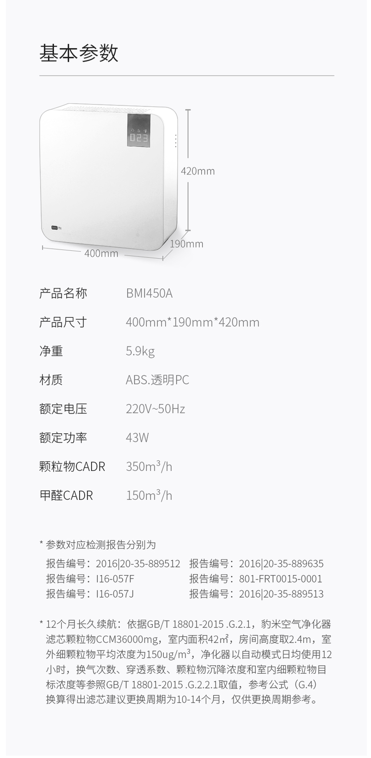 这款豹米空气净化器,型号上是BMI450A801,是豹米家2020年5月的新品,机器本身配置和450A一样。特别使用了来自日本的T- BFU除醛分子筛活性炭,能在17分钟内净化超标10倍甲醛。