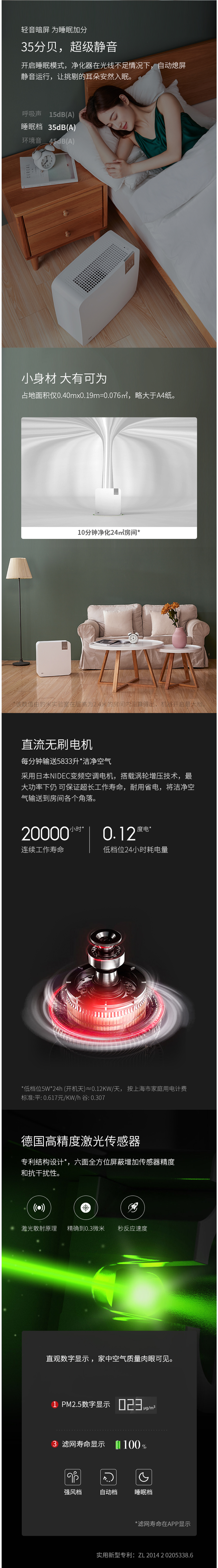 数据上:出风量375立方米每小时,对PM2.5颗粒物的净化能力是350立方米,甲醛是150立方米,激光传感器感应精准,日本无刷电机运行安静,可以手机APP查看状态;开机一整天耗电仅约0.1度,并且除醛滤网无需更换,使用成本超低,性价比超高。