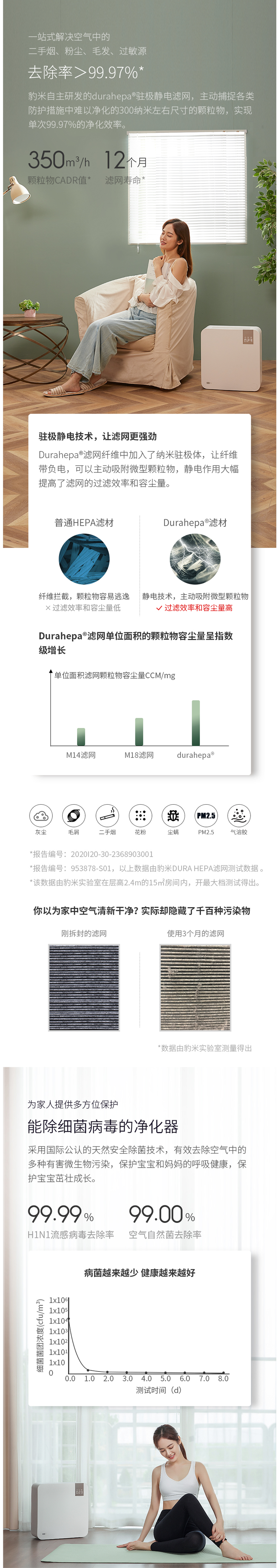 「霾霸版」使用了新款豹米联合3M研发的M14级DURA-HEPA滤网,这是一种高容尘量滤网,是国标P4标准容尘量的三倍,同时对PM2.5的净化能力更强,同时增强了颗粒更小的PM0.3颗粒的净化。
