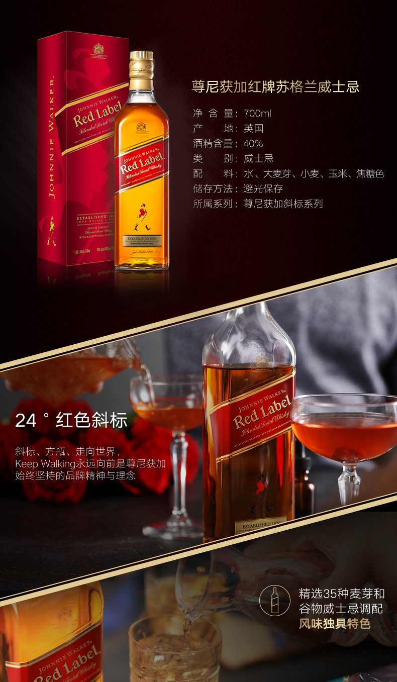 JOHNNIE WALKER尊尼获加是全球著名的苏格兰威士忌品牌,拥有200年的历史。旗下威士忌跟居市场定位不同,酒标分为红、黑、醇黑(双黑)、绿、金、铂金、蓝色,因方形瓶型也被称为红方、黑方、绿方.......每款酒使用的基酒、陈酿时间、口感、风味特点各不相同。