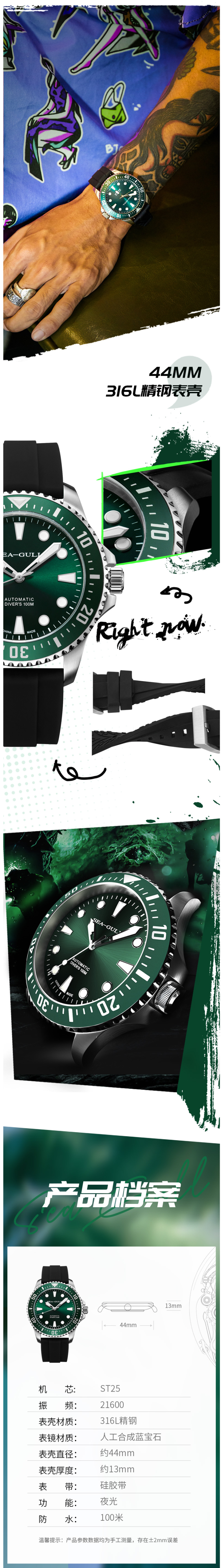 316L精钢表壳,线条圆润;棘轮式表盘,搭载旋入式表冠,苍绿色复古表盘与表圈,指针和时标都带有夜光显示,随时都能清晰看时。内置ST25缜密机芯,走时精准,100m深度防水。