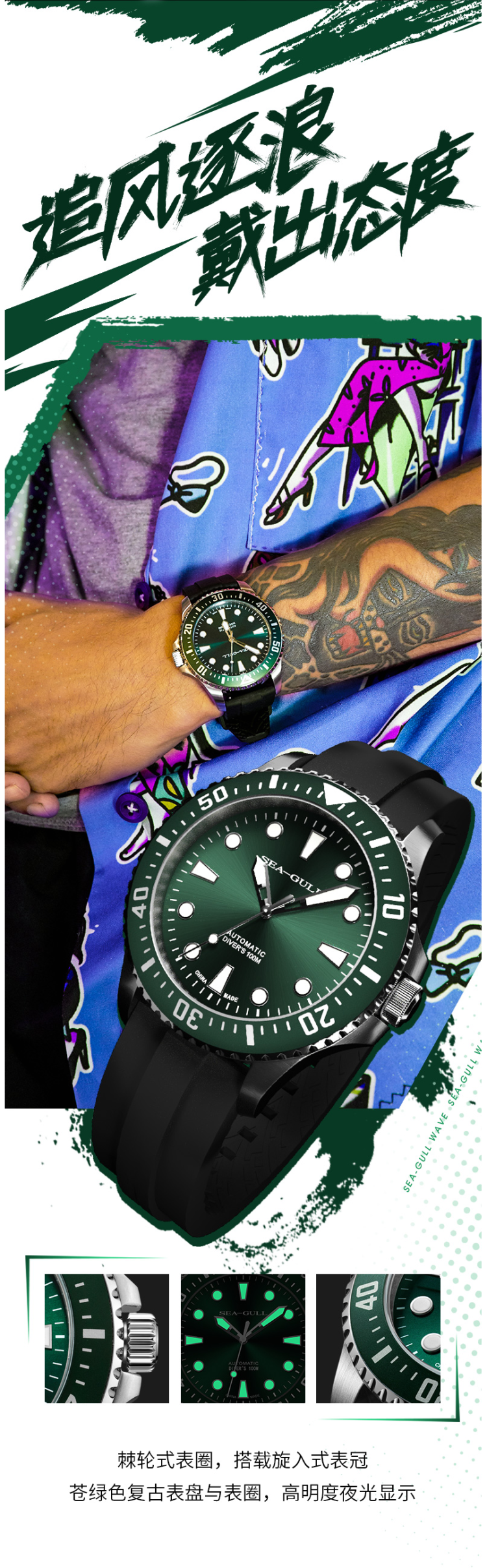 这款海鸥Seagull 海洋系列 男6105自动机械表,在款式上有点像劳力士的潜航者型系列绿盘腕表,也就是俗称的绿水鬼,逼格气息慢慢,很帅气