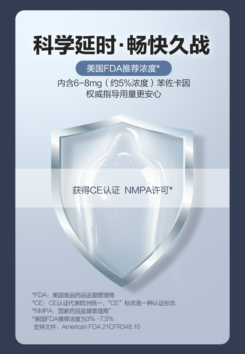 杜蕾斯 持久超薄避孕套,采用天然乳胶制成,产品如丝般轻柔,超薄超滑更敏感,含6-8mg的苯佐卡因成分,有很好的延时效果,而且不麻木见效快,安心征伐不停歇。苯佐卡因是医学上常用的脱敏成分,能降低男性的敏感程度。