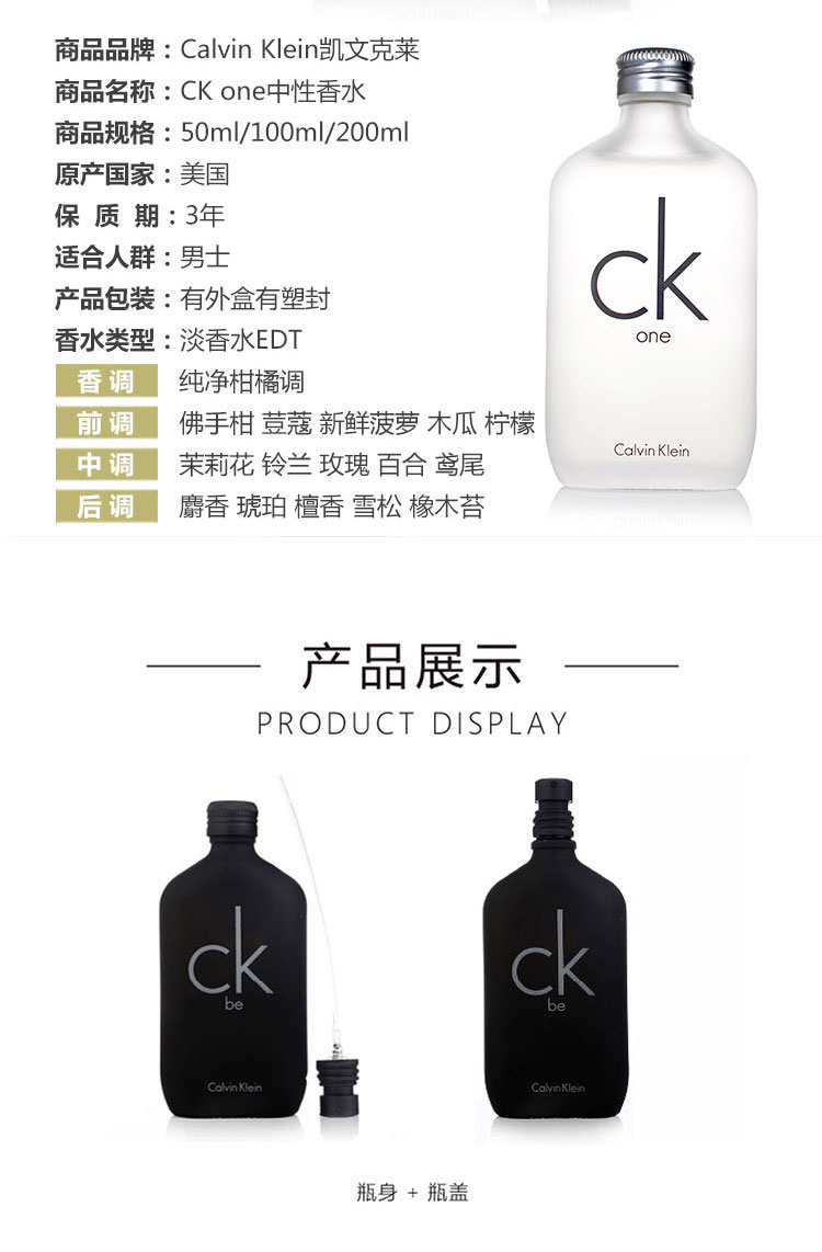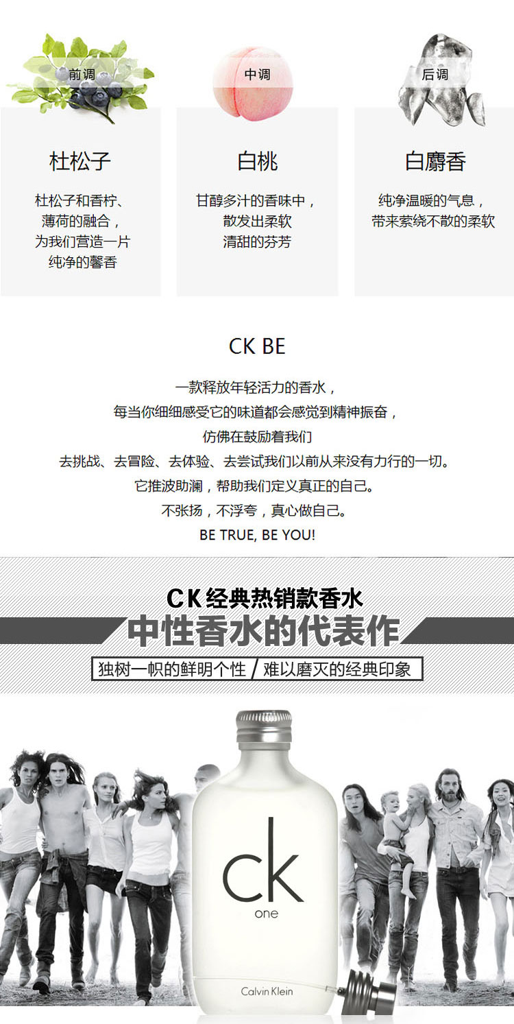 Calvin Klein ck one卡莱优淡香水是一款风格清新明快的香水,整体属于果香调,中后调很清新。从网友评价来看,这个香水每次喷一点都够了,能用很久。味道不是很浓,不甜也不腻,前调味道会有一点大。前调:香柠檬油、小豆蔻与新鲜的番木瓜。中味:茉莉、玫瑰、百合、鸢尾草 ,后味:檀香、雪松、麝香、琥珀、橡木苔,EDT淡香型。