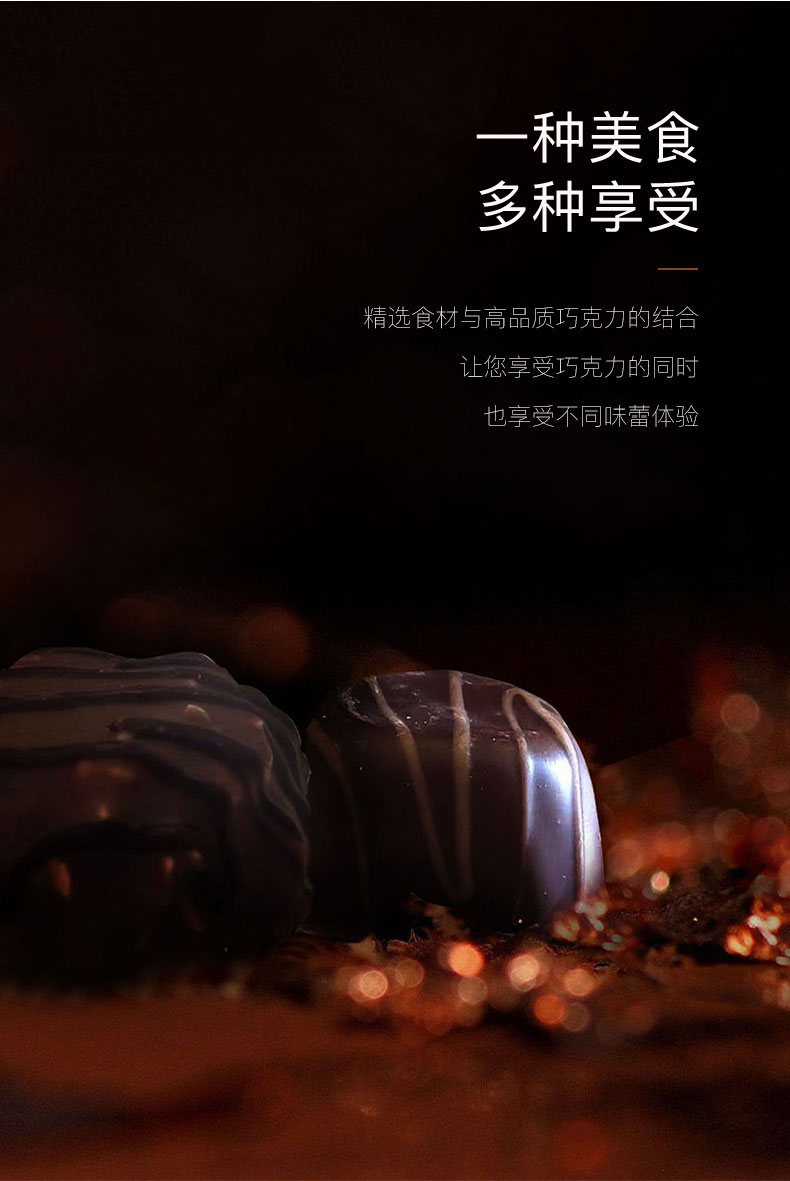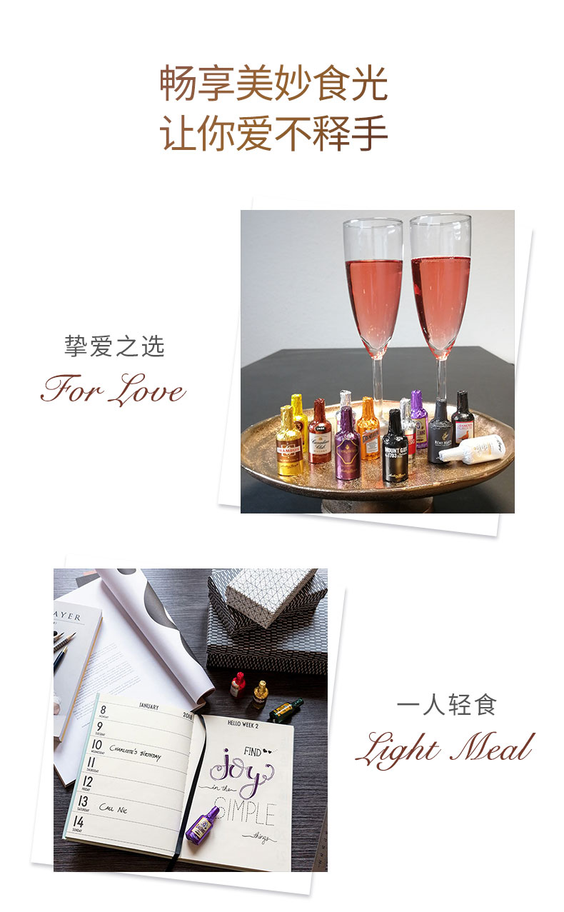 其口味醇正细腻,温润香醇,浓郁丝滑。它的特殊技术是可以直接将高浓度的烈酒注入巧克力中,保持了酒的纯度和原味。高纯度的黑巧克力制成小酒瓶形状的外壳,注入一系列世界名酒,口味独一无二。