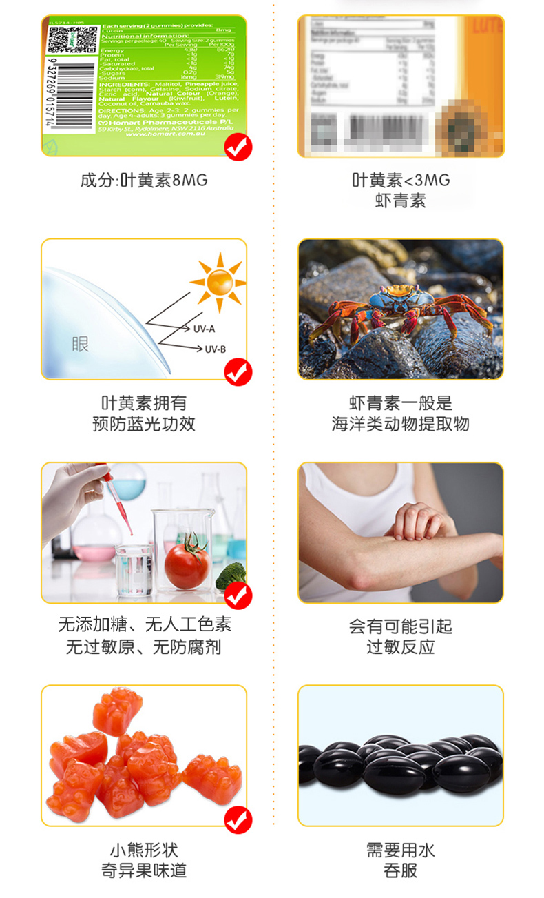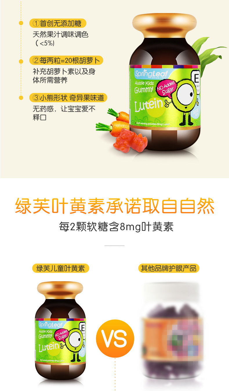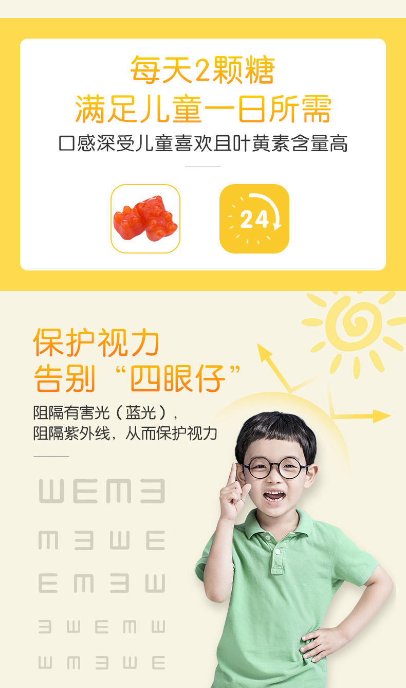 澳洲原装进口的儿童叶黄素软糖,首创不添加糖技术,采用天然果汁调味调色,每天2粒,抵20根胡萝卜的叶黄素含量,有效缓解视疲劳,阻隔有害蓝光,预防近视,保护孩子视力,软糖设计,小熊形状,奇异果味道,孩子爱吃。规格200g,约85粒。