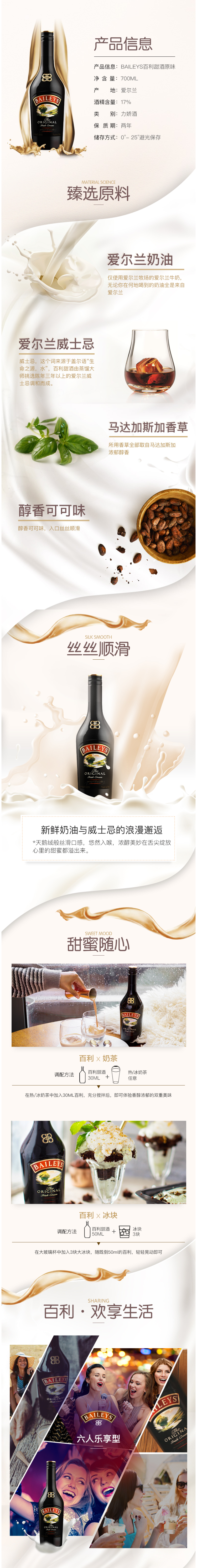 由新鲜的爱尔兰奶油、纯正的爱尔兰威士忌、各种天然香料、巧克力以及爱尔兰精酿烈酒调配而成,口感馥郁香甜,可用来搭配各种甜点、冰淇淋等,美味更增。