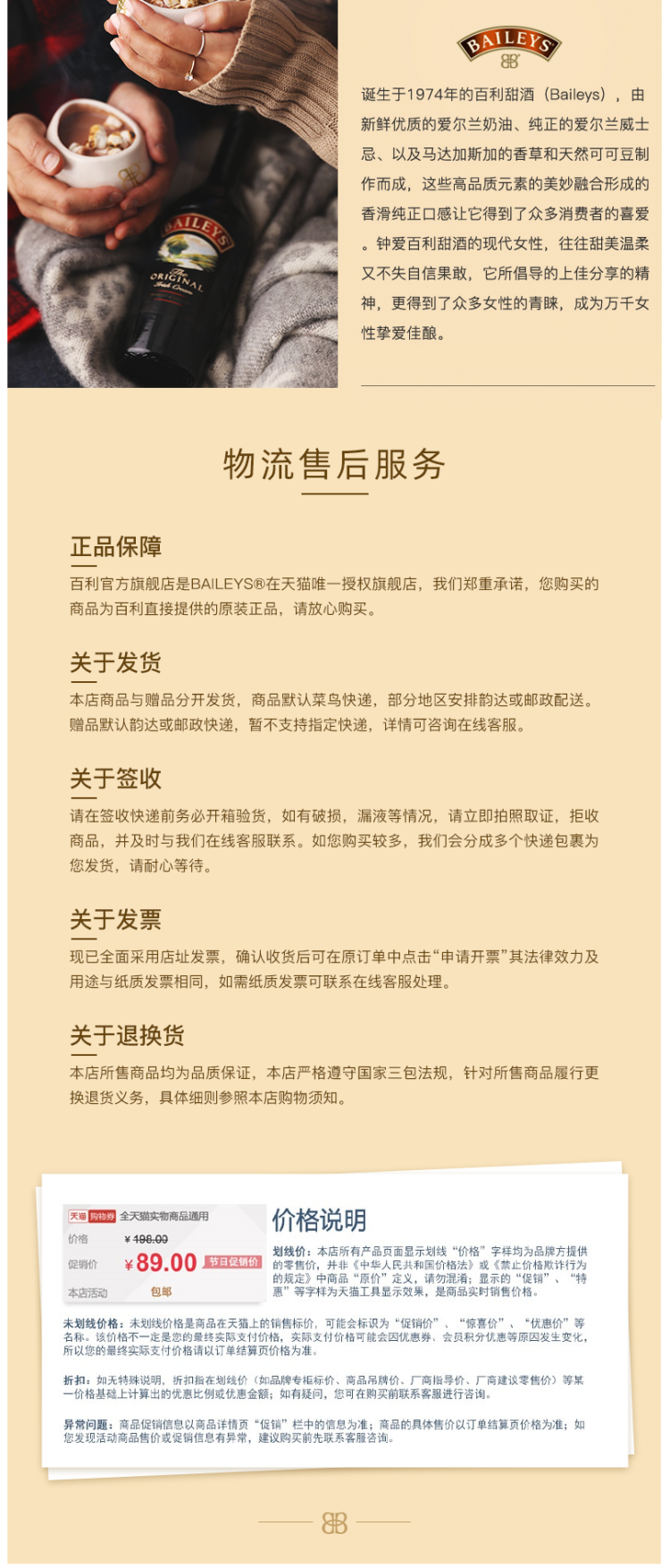 天猫百利官方旗舰店,4-19日 过年不打烊,¥116元 新年价,-15元优惠券,=101元 到手价,这款百利 Baileys 甜酒 原味,是世界第一的利口酒,爱尔兰进口,酒精度17%,适合加冰饮用,加咖啡饮用口感也非常好。