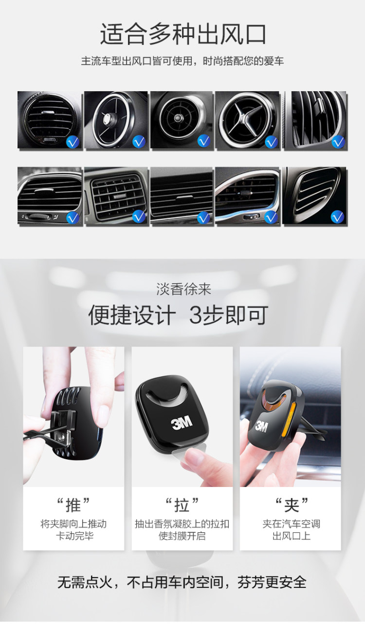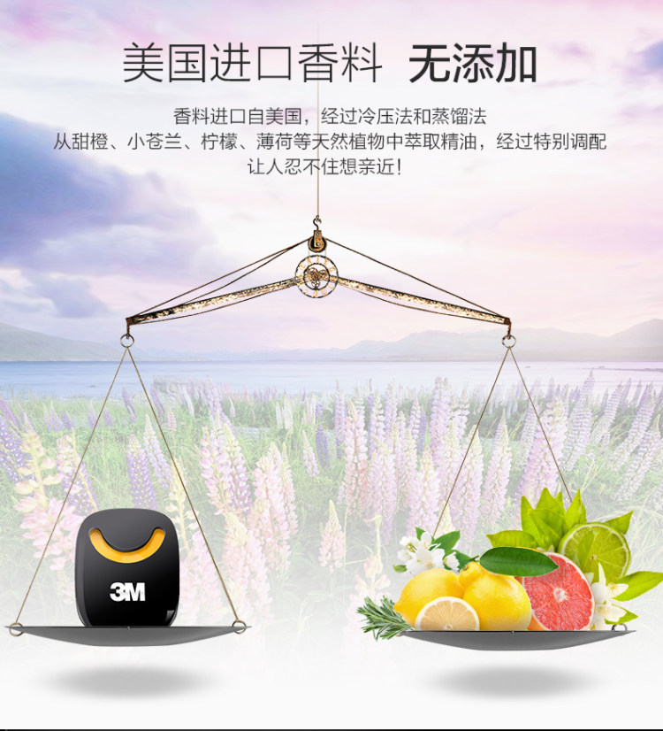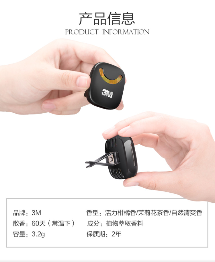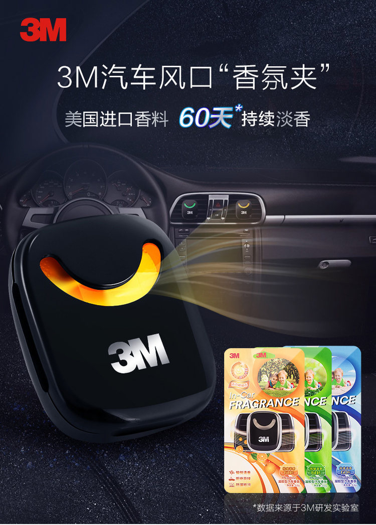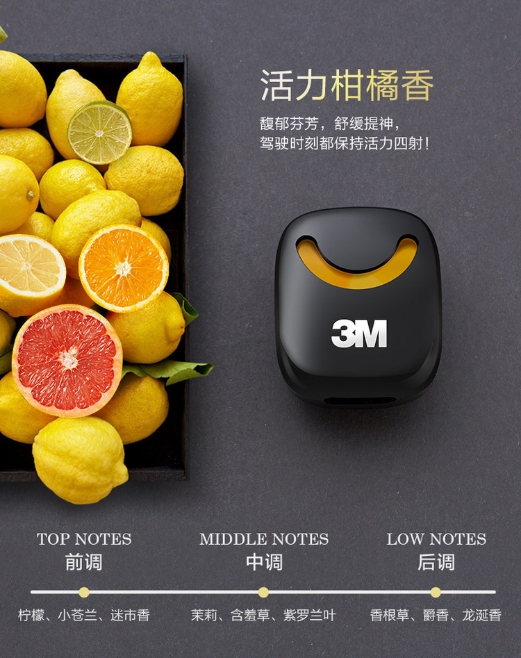 这款3M车载香水,使用起来非常方便,只需夹在空调的出风口处即可,内置美国进口香料,经过冷压法和蒸馏法,从甜橙、小苍兰、柠檬、薄荷等天然植物中萃取的精油,再经过特别配方调制而成,香味清新怡人,可祛除车内的异味、甲醛。