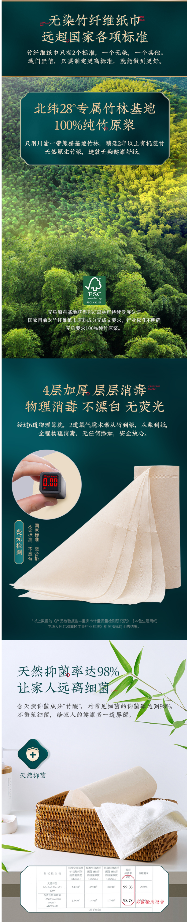 这款无染无芯卷筒纸,精选有机慈竹纤维,纯竹本色,无有害添加,FDA食品认证,可直接接触食品,内部添加天然提取的竹锟精华,抑菌率高达98%,四层加厚,擦拭不掉屑,可代替面巾纸,卸妆纸、厨房纸,可干湿两用,强力吸水不易破。