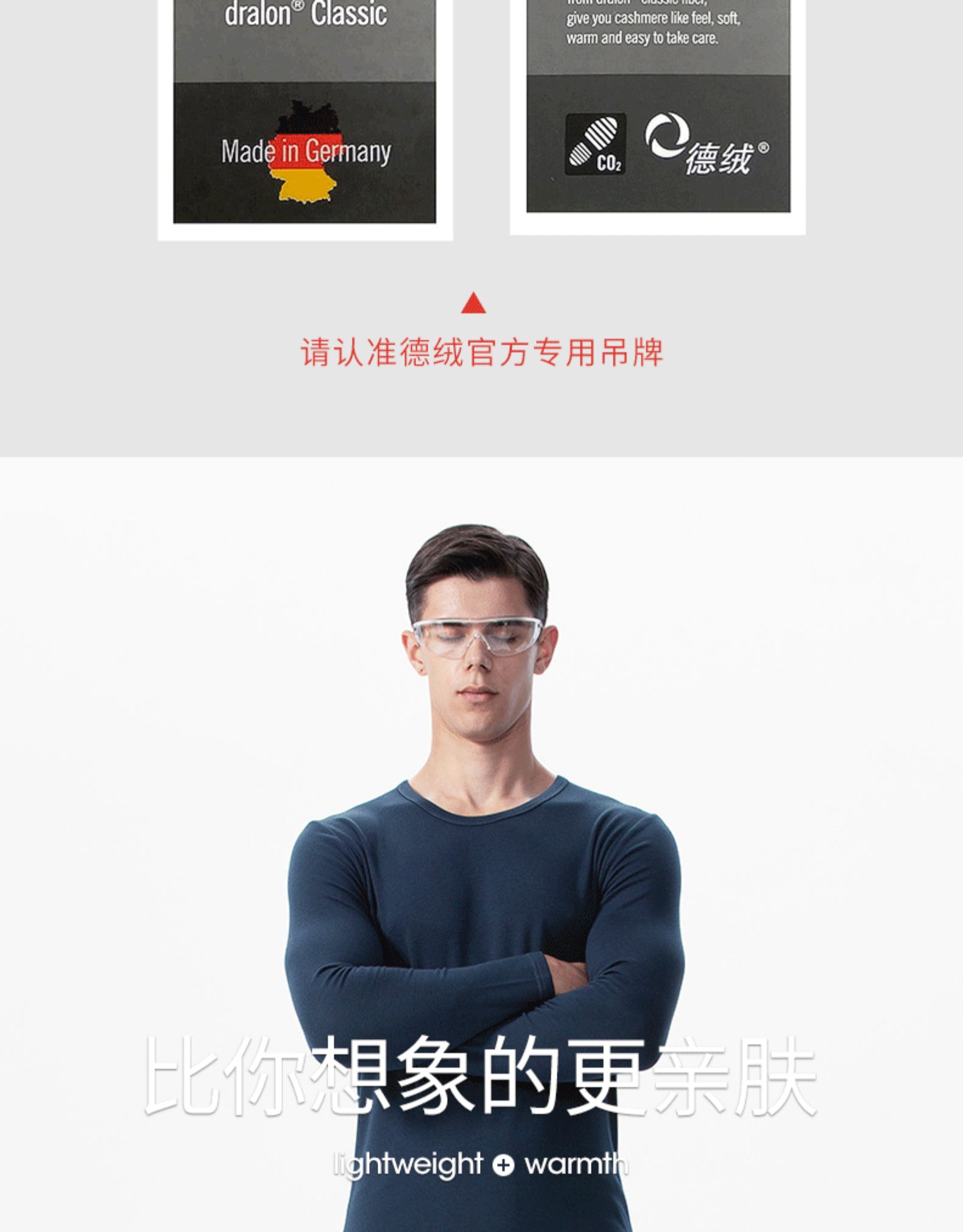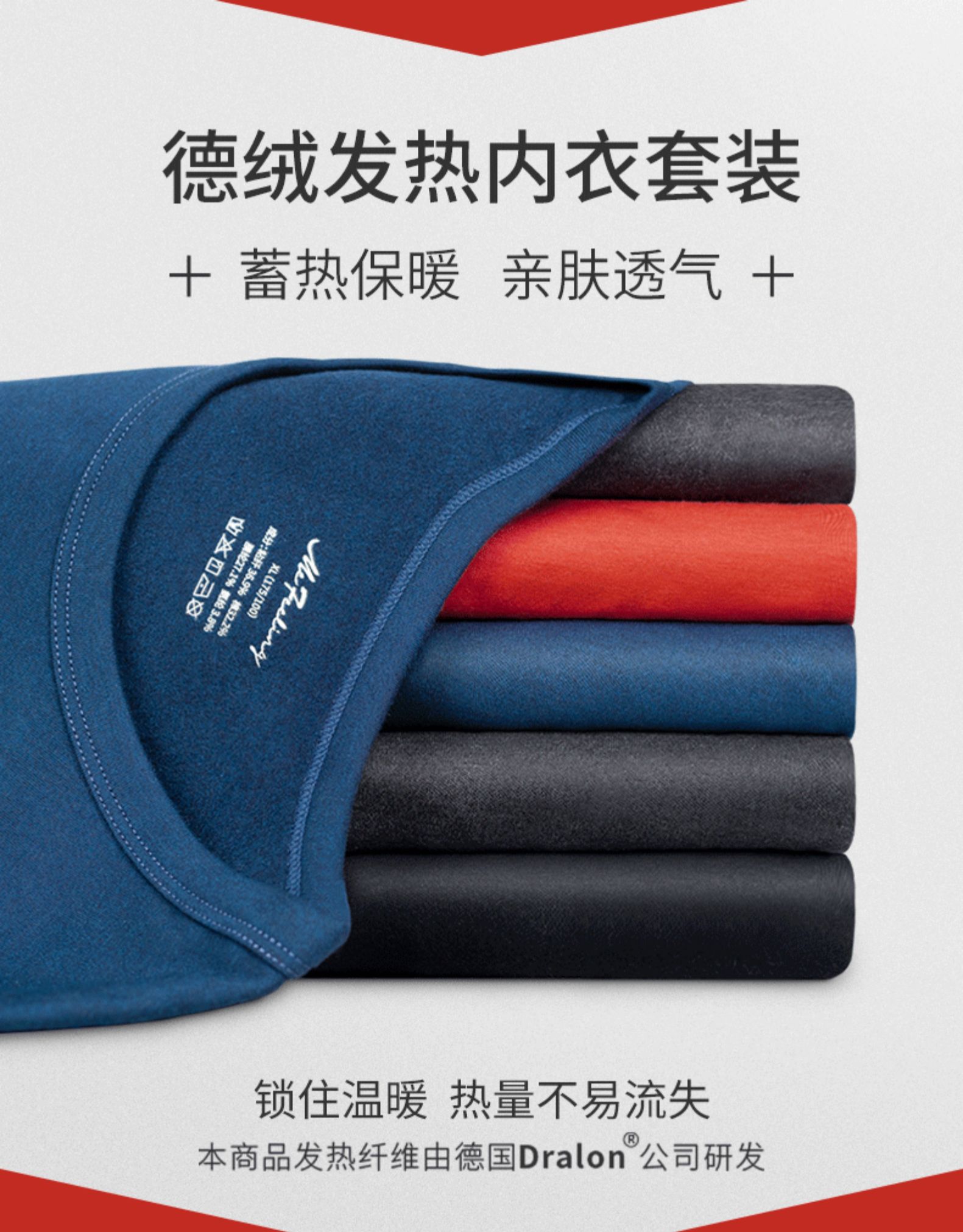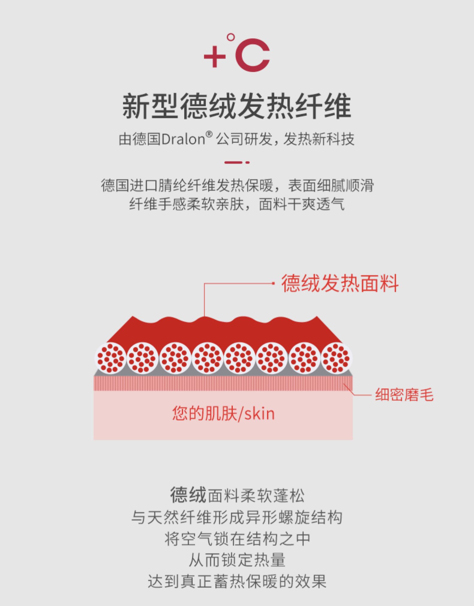 这款英国me feeling 德绒自发热保暖内衣套装,采用由德国Dralon公司研发的发热纤维,磨毛工艺,上身即热,舒适保暖,柔软亲肤,干爽透气;人性化开口门襟设计,无感标签,消灭了缝制标签和化学品的刺激伤害。