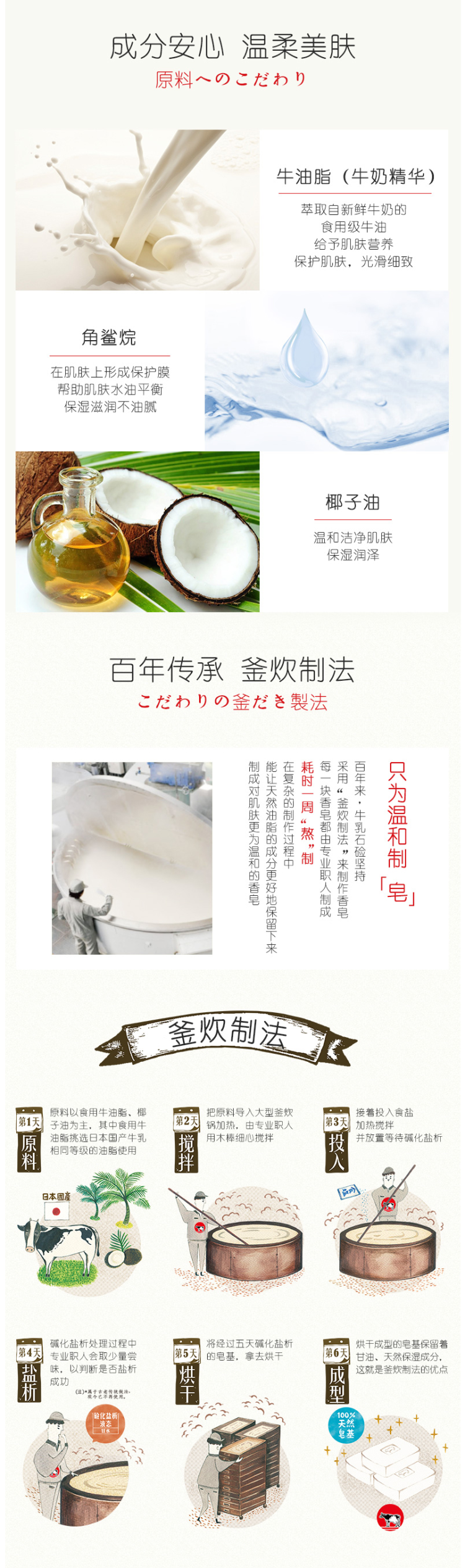 官方的说法是:牛牌香皂采用天然温和配方,内含牛乳精华及植物性角鲨烯,可令肌肤柔滑保湿,使用时泡沫丰富,可彻底清洁身体及面部。我们的感受是,使用牛牌香皂平常皮肤不干,除了洗脸洗手,洗澡时也直接用这香皂代替沐浴露,非常好冲洗。