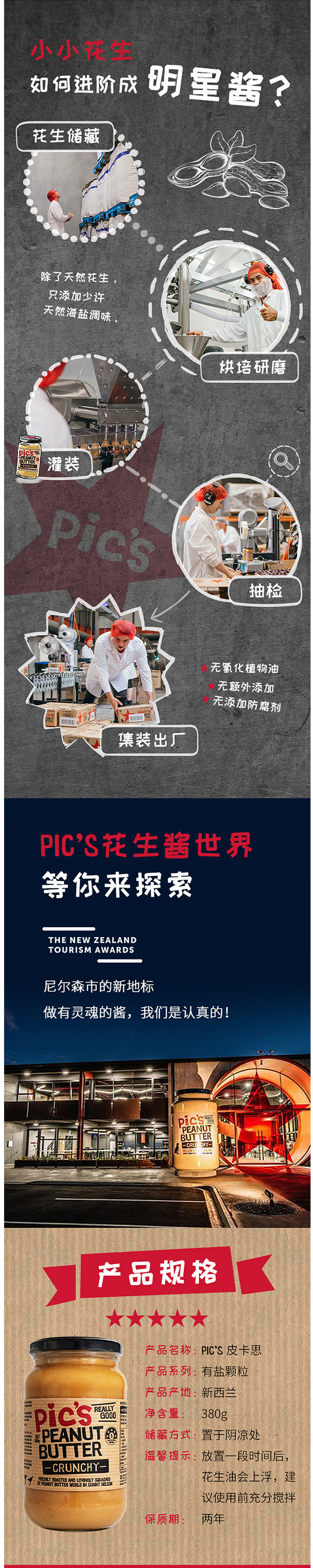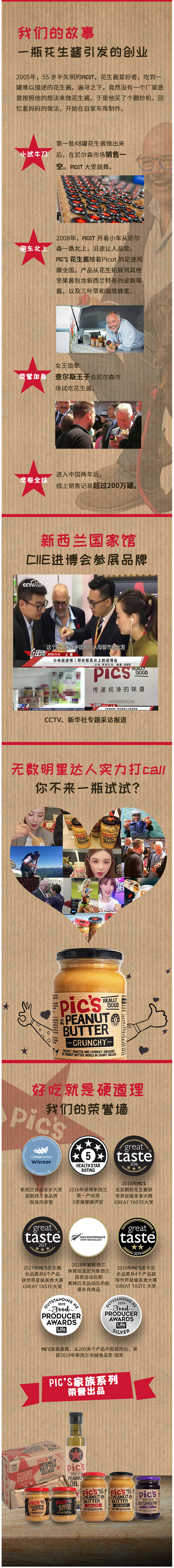Pics的花生酱是新西兰国宝级的花生酱,也是全球最畅销的花生酱,在2014年新西兰最佳儿童食品提名奖1、2016年获得了世界星级美食大赛GREAT TASTE大奖,这个奖项堪称食品界的“奥斯卡”,含金量无可争议。