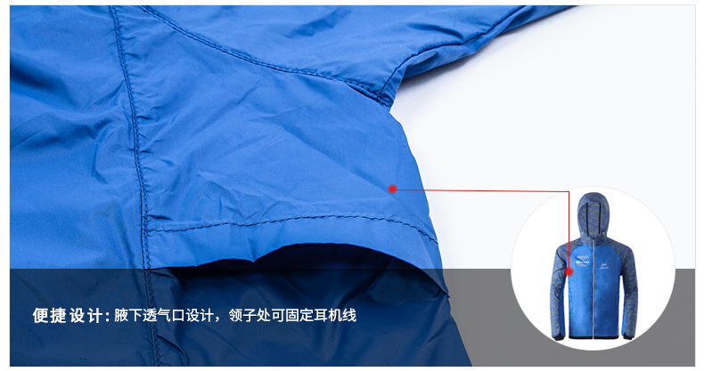 在款式上,一体连帽设计,腋下有专门的透气孔,弹力松紧袖口和下摆防止漏风,YKK拉链,衣面上是清晰鲜明的印花。