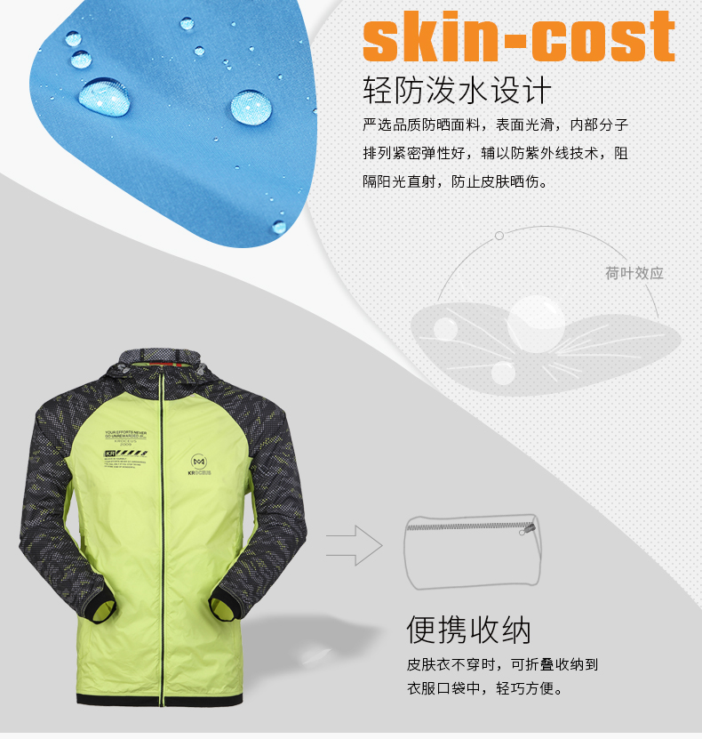 好的皮肤风衣近乎99%防风,适合春夏秋三季穿,春秋防风,夏季早晚御寒,白天防晒。皮肤风衣面料非常薄,一般男款仅重100克,女款可轻至50克,收起来只比手机大一点,可随身携带应付天气的突变。除了防风,皮肤风衣也要透气,能隔水防小雨,能防晒,重量要轻,款式也要好。