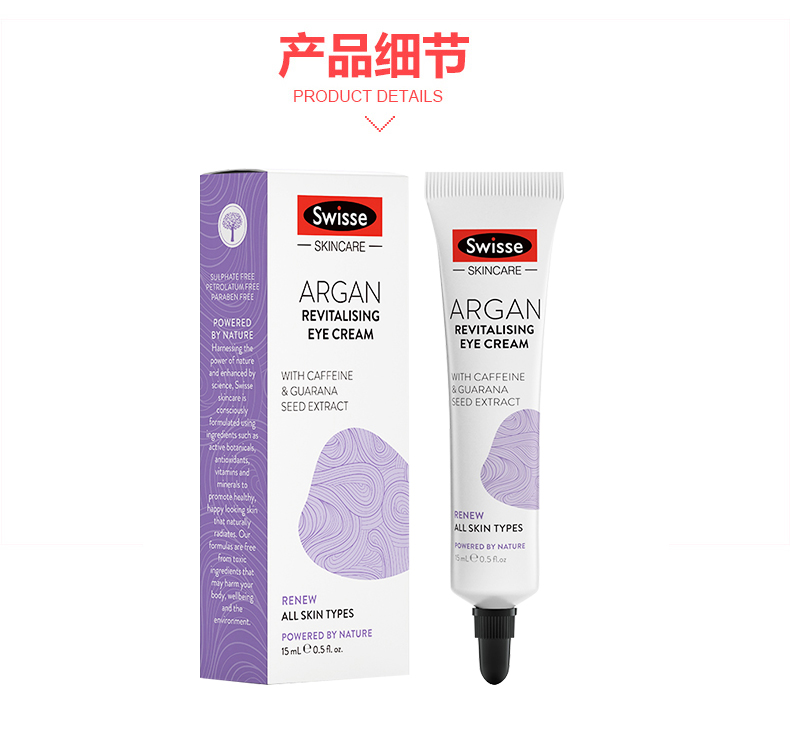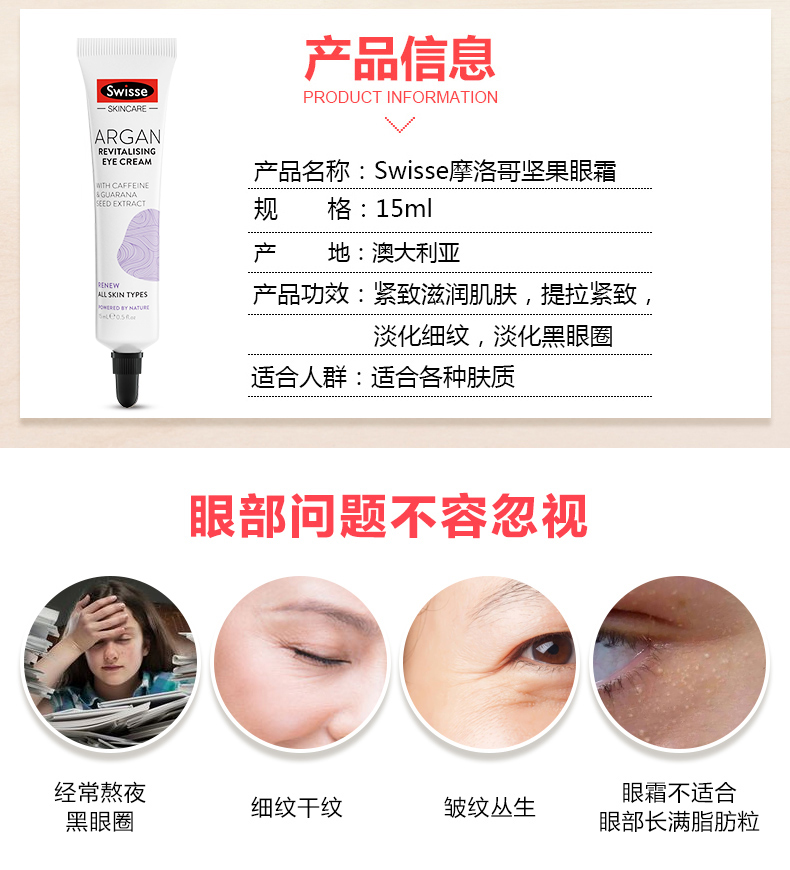 这款Swisse 摩洛哥坚果眼霜,医学配方专业解决眼部问题,主要成分是摩洛哥坚果油、维生素K2、咖啡因,适合各种肤质,通过临床试验,综合28天试用数据,95%试用者眼袋明显变小,70%眼袋基本消除。